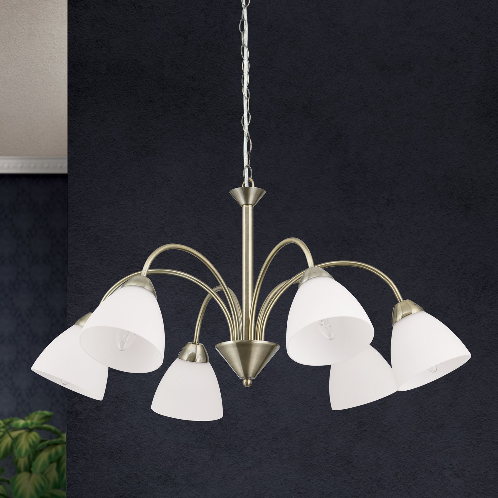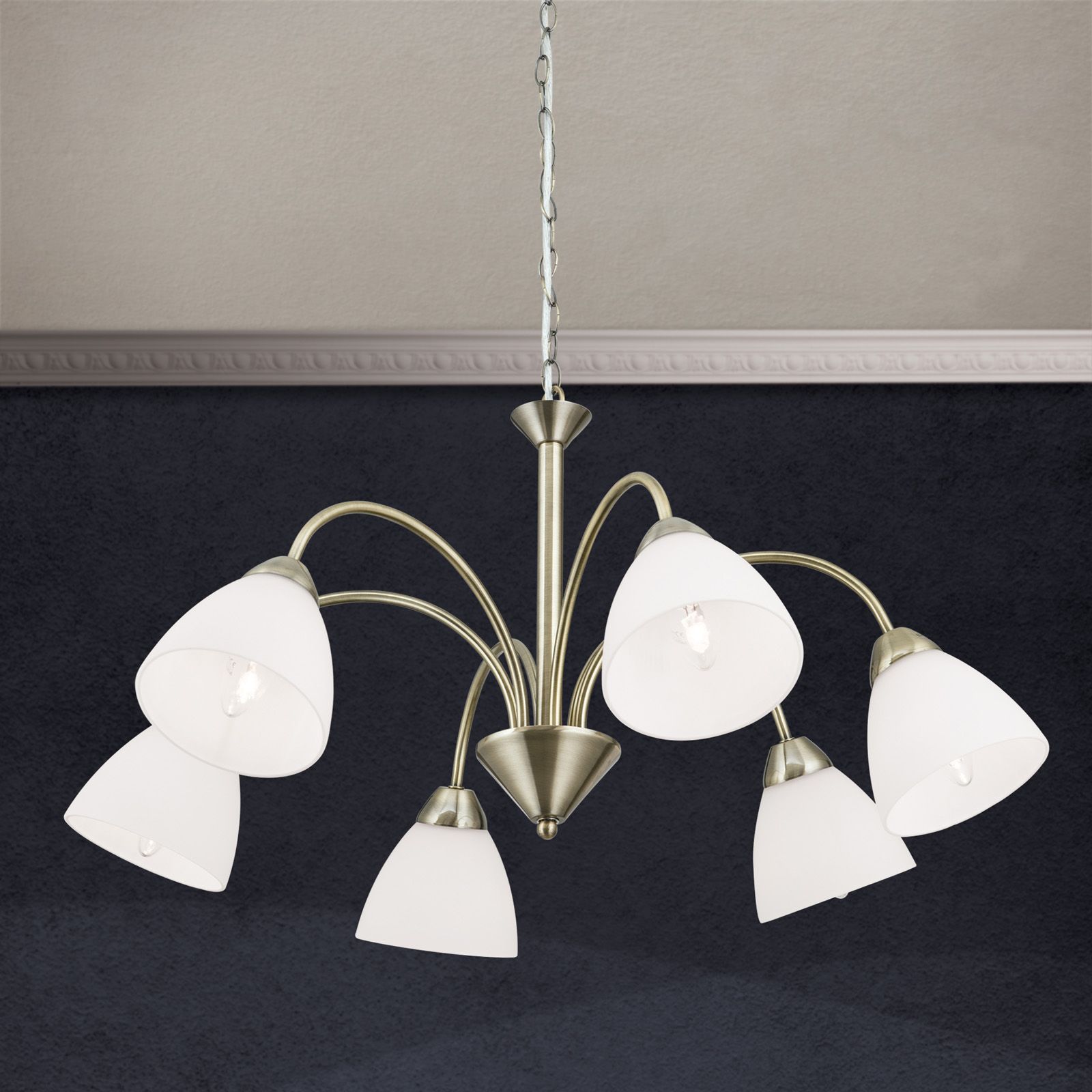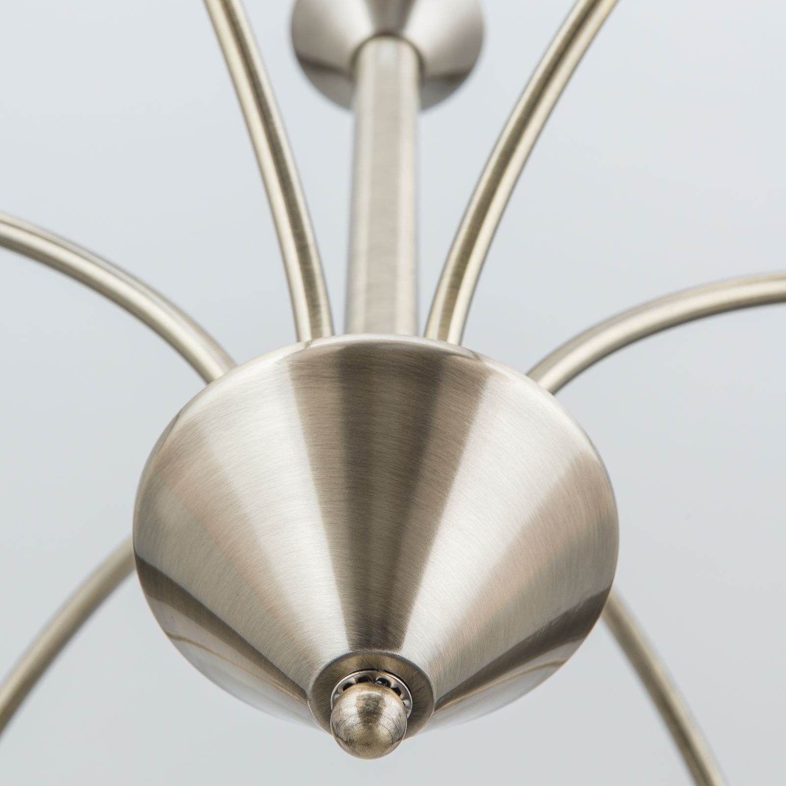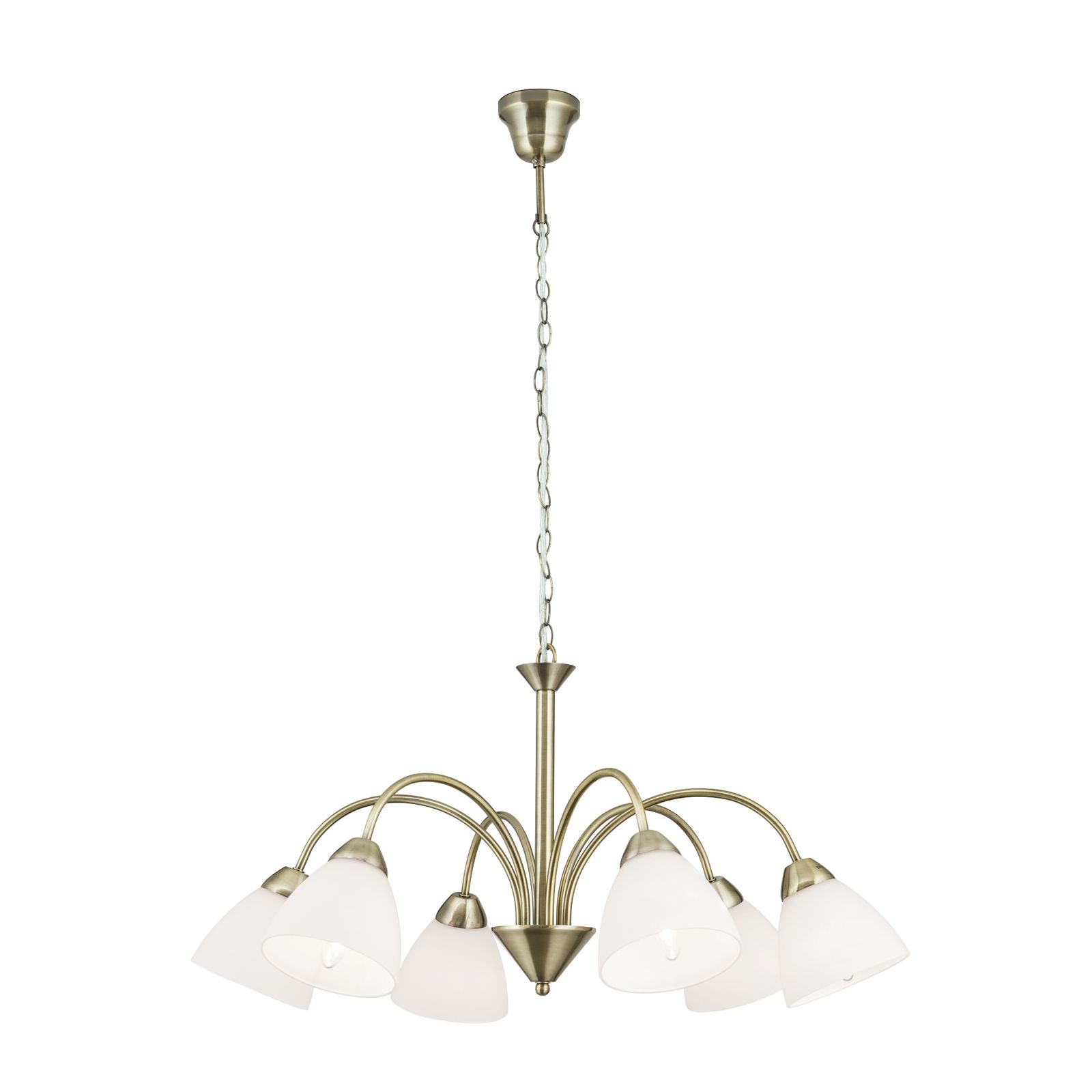 The SUSAN series chandelier fits equally well into modern living, dining or bedroom interiors as well as into more traditional ensembles courtesy of its elegant basic shapes and the dynamic sweep of its six arms. The goblet-shaped glass shades spring from a central cone like the spouts of a fountain. The matt brushed patina look underlines the high-quality workmanship. The ceiling rose's bell-shaped decoration is also a stylish statement. Six E14 sockets each offer 40 watts maximum thus supplying even large rooms with a stylish and pleasant basic illumination. Clear or matt candle-shaped bulbs round off the design perfectly.