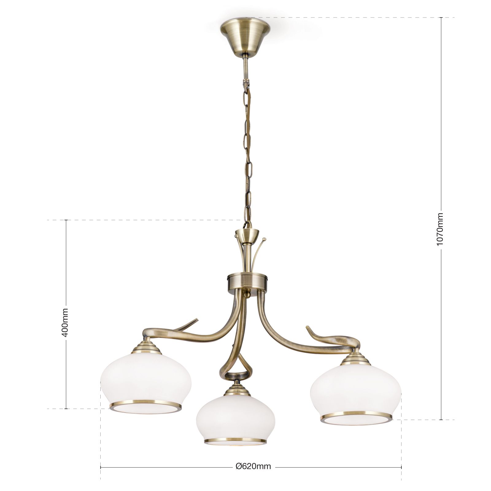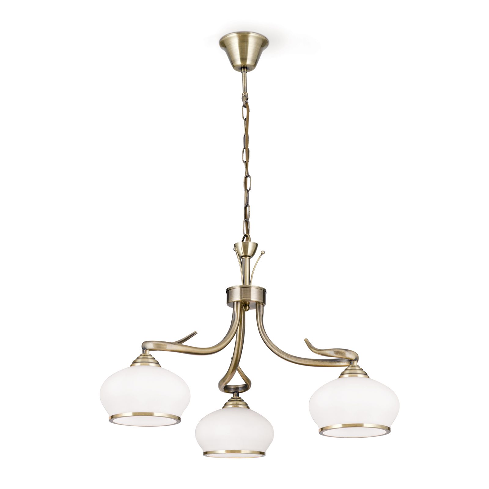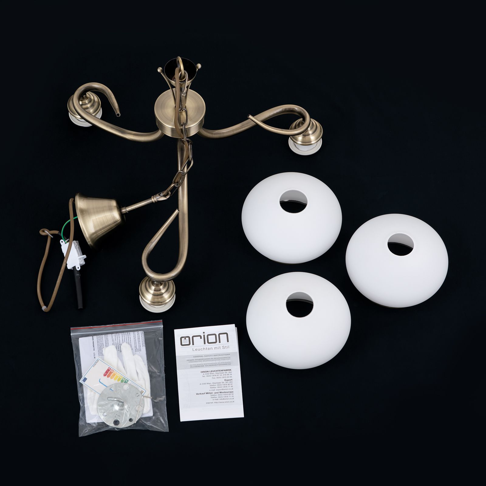 3-flame chandelier from the VEGO series skillfully plays with country style's rustic simplicity: no ornamentation so typical of baroque chandeliers, instead playful elements give it a carefree lightness. The arms swing from the centre to the shades, only to turn around in a dynamic arc. Small rods with ball tips grow boldly out of the arms' base and are crowned by a shell. The chain is hooked into this, ending in a bell-shaped rosette. Above a dining table or in a large entrance hall, this chandelier is sure to create an inviting atmosphere. Three E27 sockets for 60 watts maximum of 60 watts supply sufficient light.