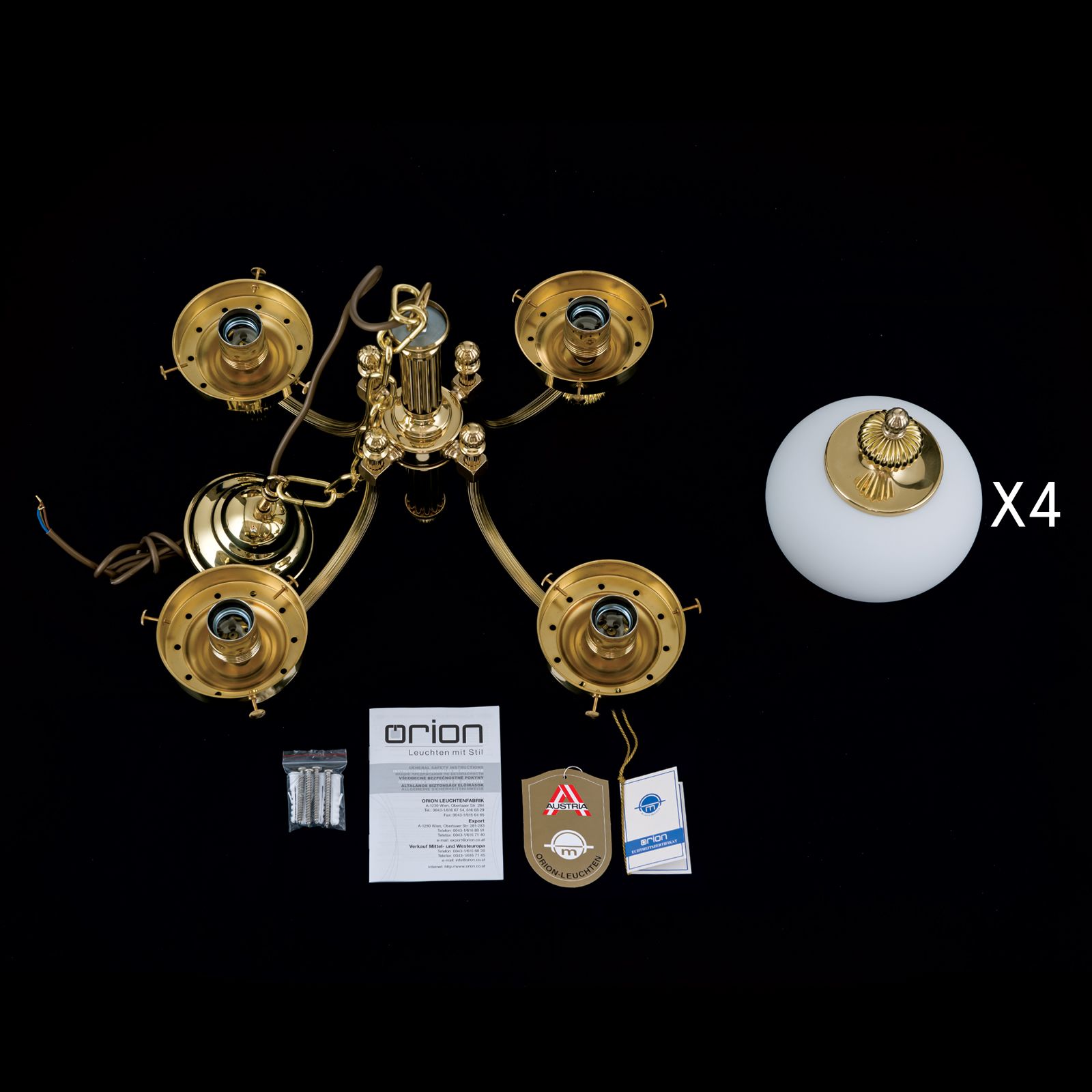 Chandelier WIENER NOSTALGIE, 4-flames, shiny brass, with opal matt glass, upwards