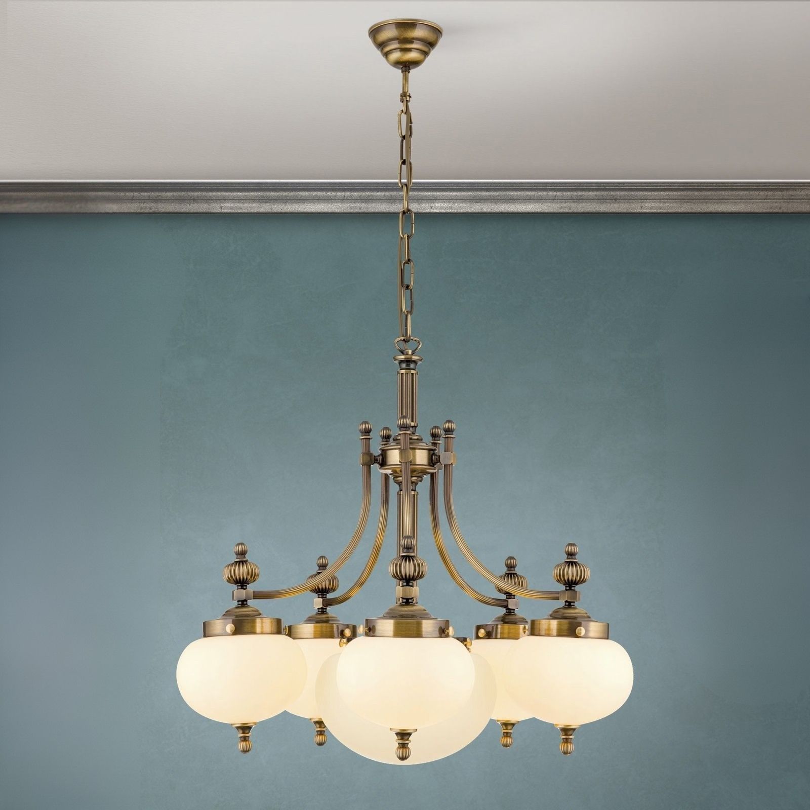 The chandeliers from the WIENER NOSTALGIE series are worthy representatives of the traditional Viennese coffee house style. The obvious need for powerful lighting is met by generously sized glass shades radiating downwards. The high-quality brass frame with fluted column and sweeping arms fades modestly into the background. The folding spheres as shade finials playfully quote the receding splendour of historic chandeliers. Its luminosity is suitable for 20 to 30 square metre rooms ranging from antique style to functional-modern. The chandelier is fitted with six E27 sockets, each with 60 watts maximum.
