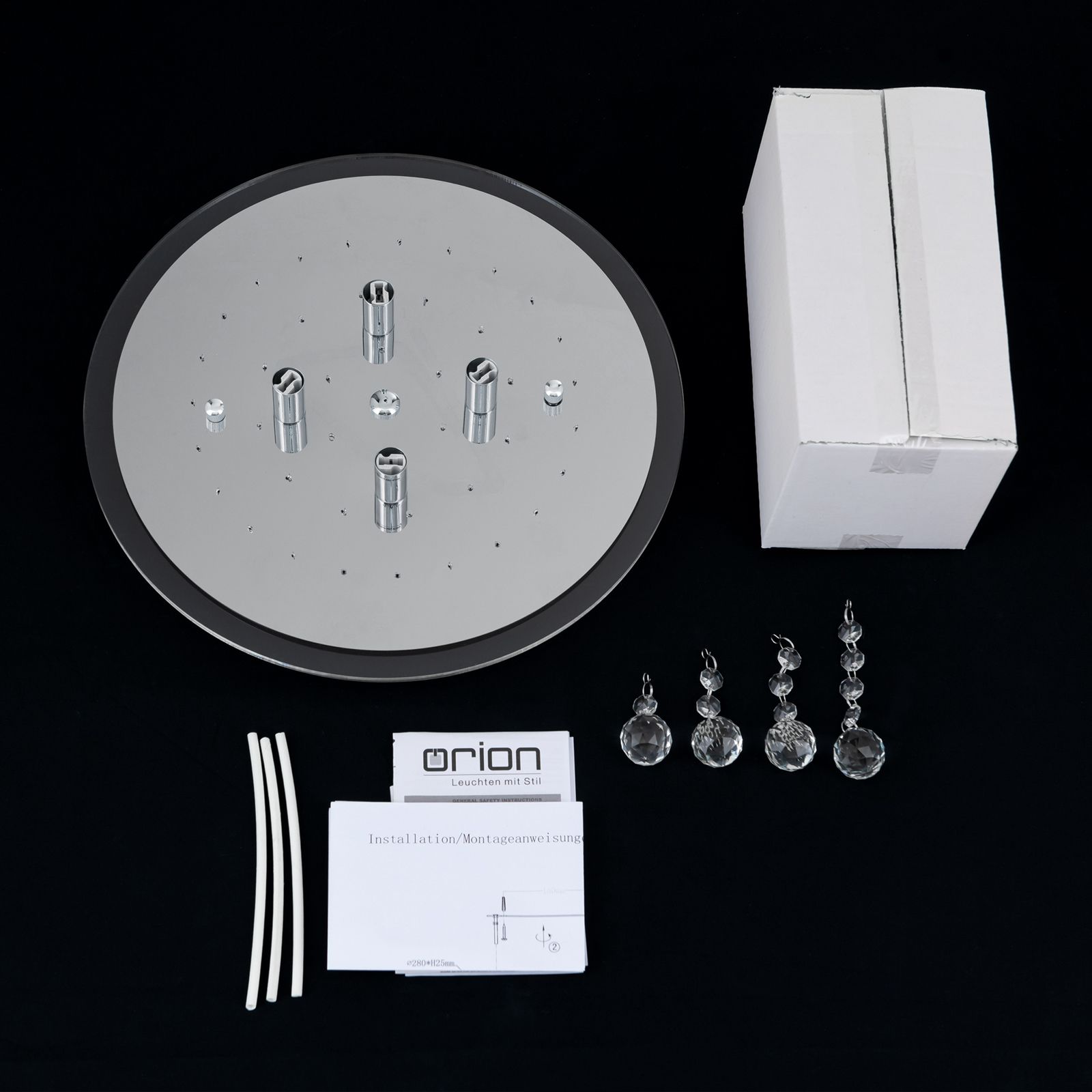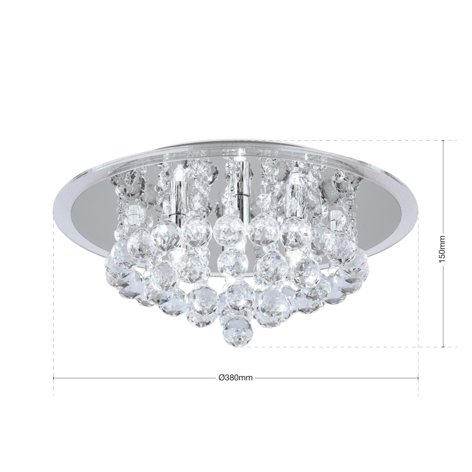 Ceiling chandelier GLORIA with its crystal glass hangings is truly a sensation in any room. The light refracting in its high-quality K9 crystals creates amazing and impressive light play turning the chandelier into a luxurious accessory. The effect is underlined by the mirrored decorative plate. Its playful, glamorous appearance and light effects make it an eye-catcher in any living or dining room. The dimmable ceiling light is equipped with four G9 sockets and can be fitted with light bulbs of up to 40 watts.