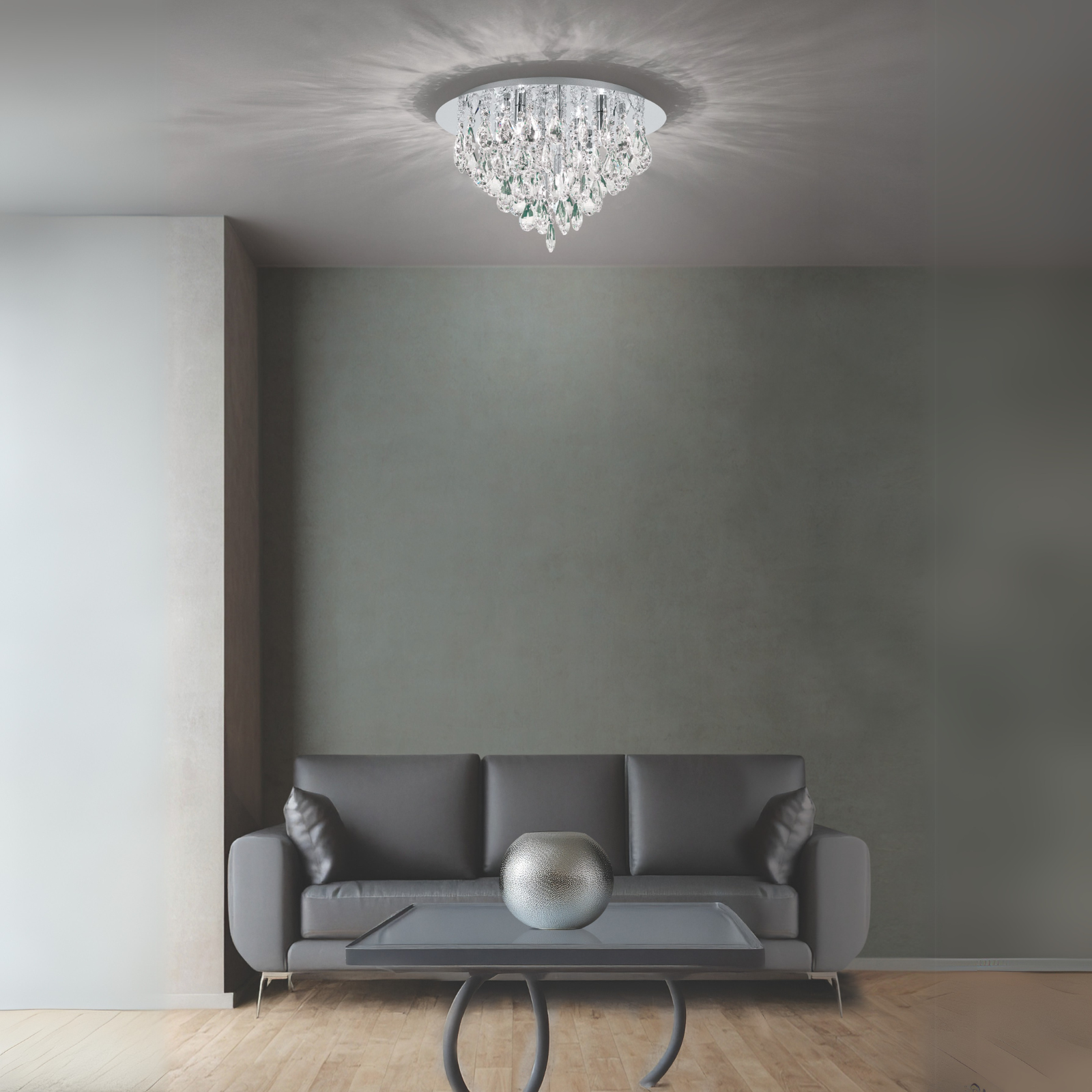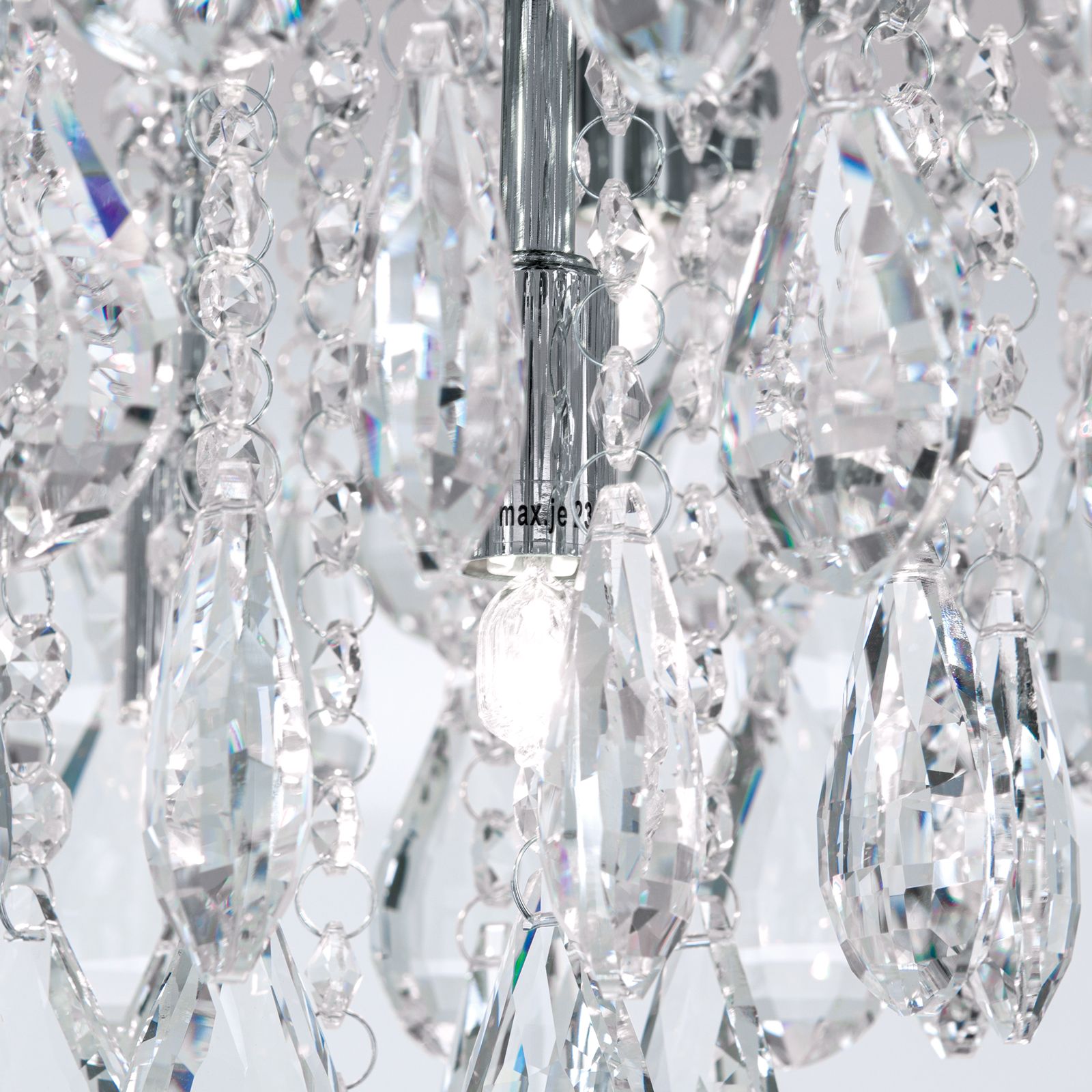 The crystal ceiling lamp enchants with its rich jewelry and compact shape. With a height of 31 centimeters, it can be used even in rooms with low ceilings. Its decorative character predestines it for use in the living room or entrance hall, but it can also create a magical ambience in the bedroom.