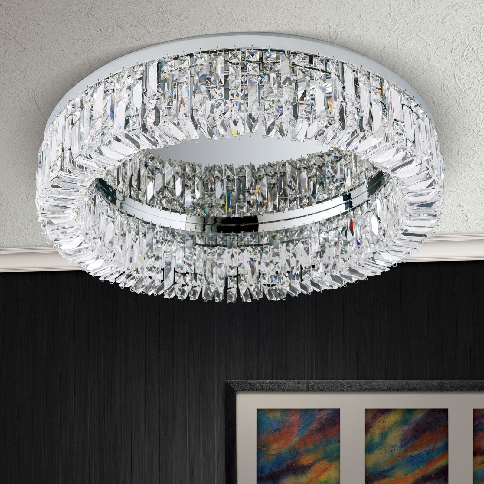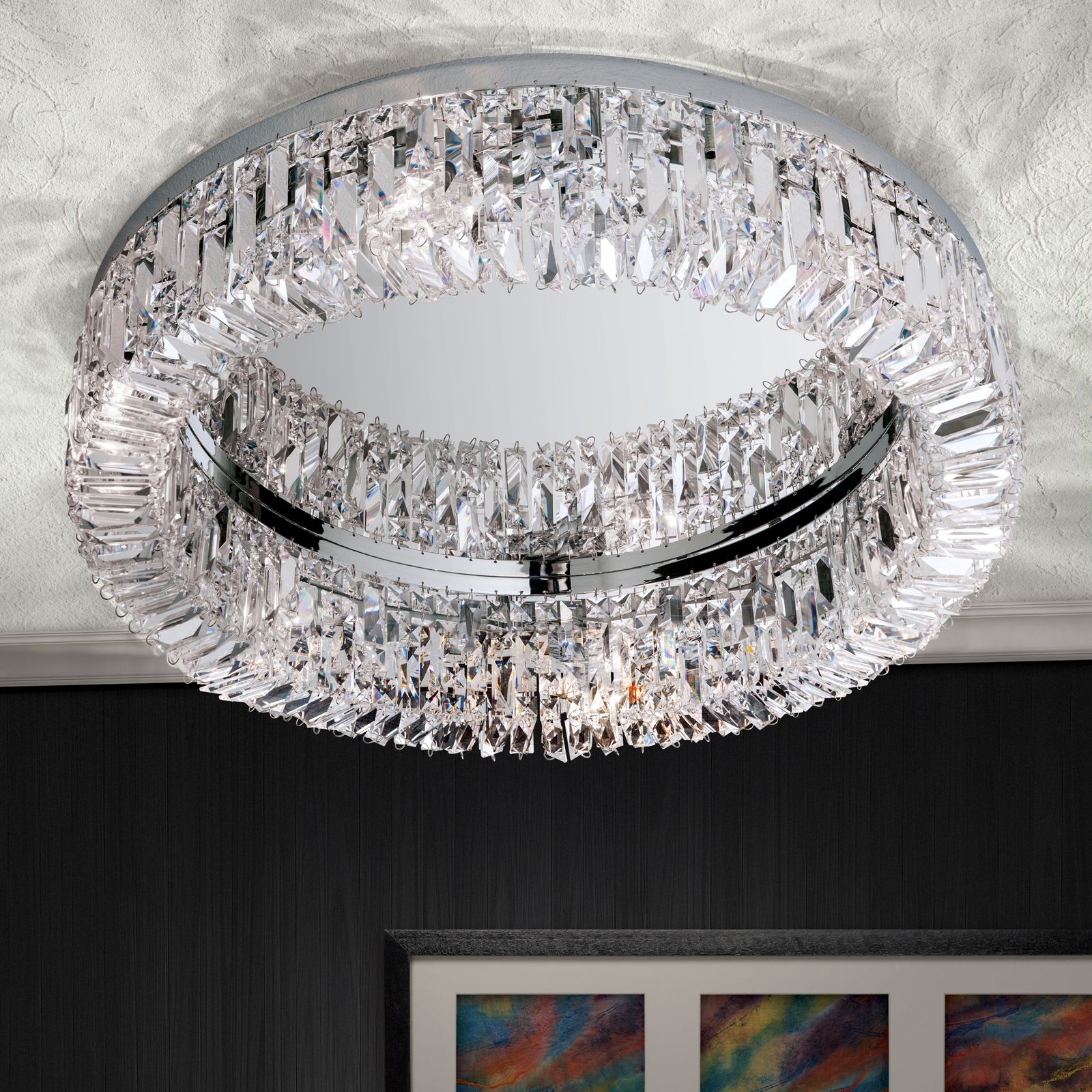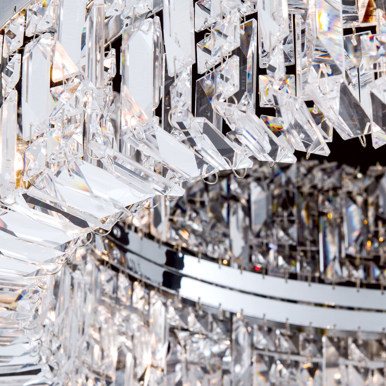 The ceiling light from the RING series spreads modern flair with versatile installation options. Nothing stands in the way of mounting it bedrooms, living rooms, dining rooms or even in entrance areas, where it provides dazzling illumination. The combination of chrome-plated brass frame with clear SCHÖLER CRYSTAL® crystals complement each other perfectly making the chandelier an extravagant furnishing element. The numerous crystal prisms impress whether switched on or off to create beautiful reflections. Equipped with 6 E14 sockets, it can be fitted with 40 watts maximum. The chandelier with a diameter of 60 cm has a height of 14 cm and is therefore ideal for rooms with low ceilings. The light is available in chrome and gold.