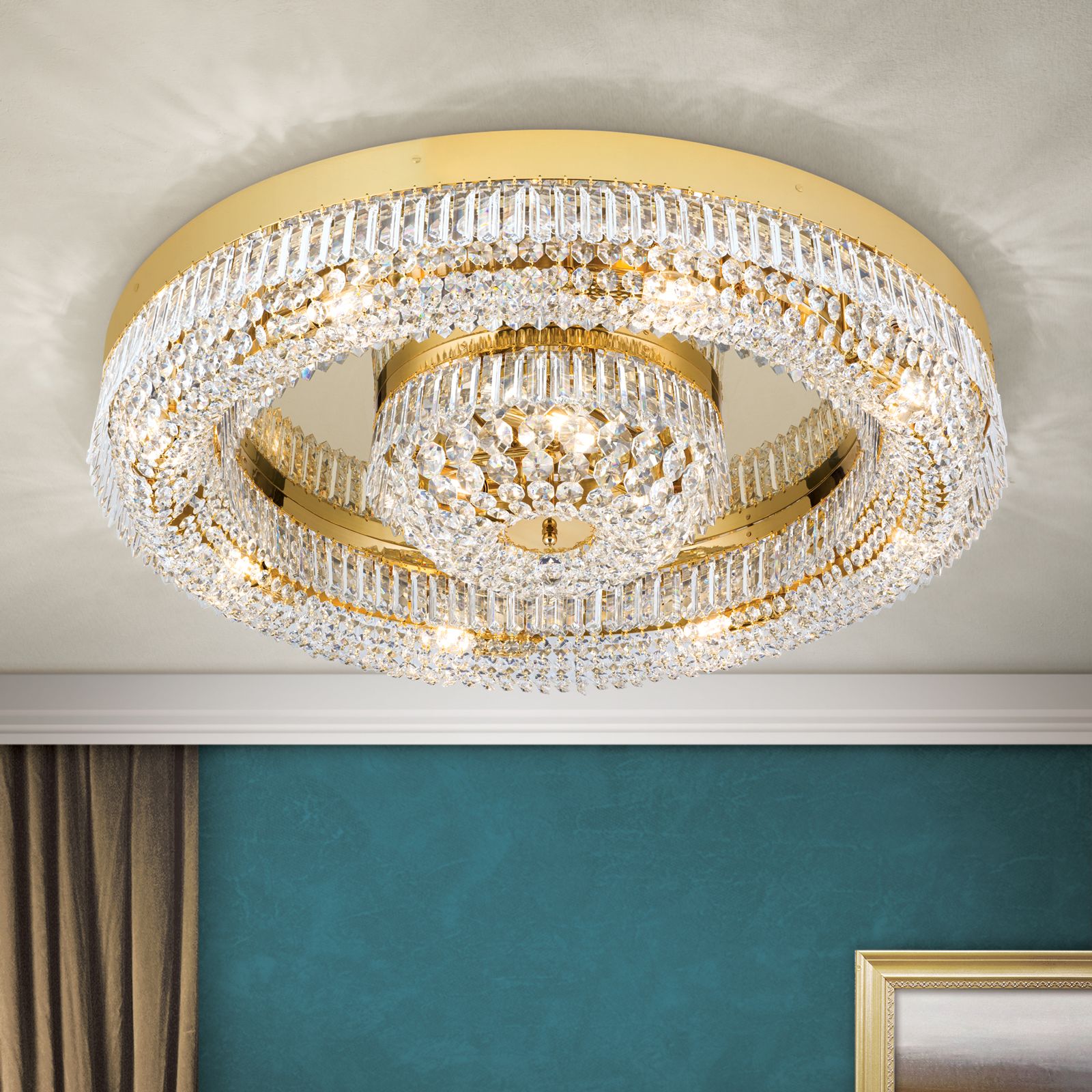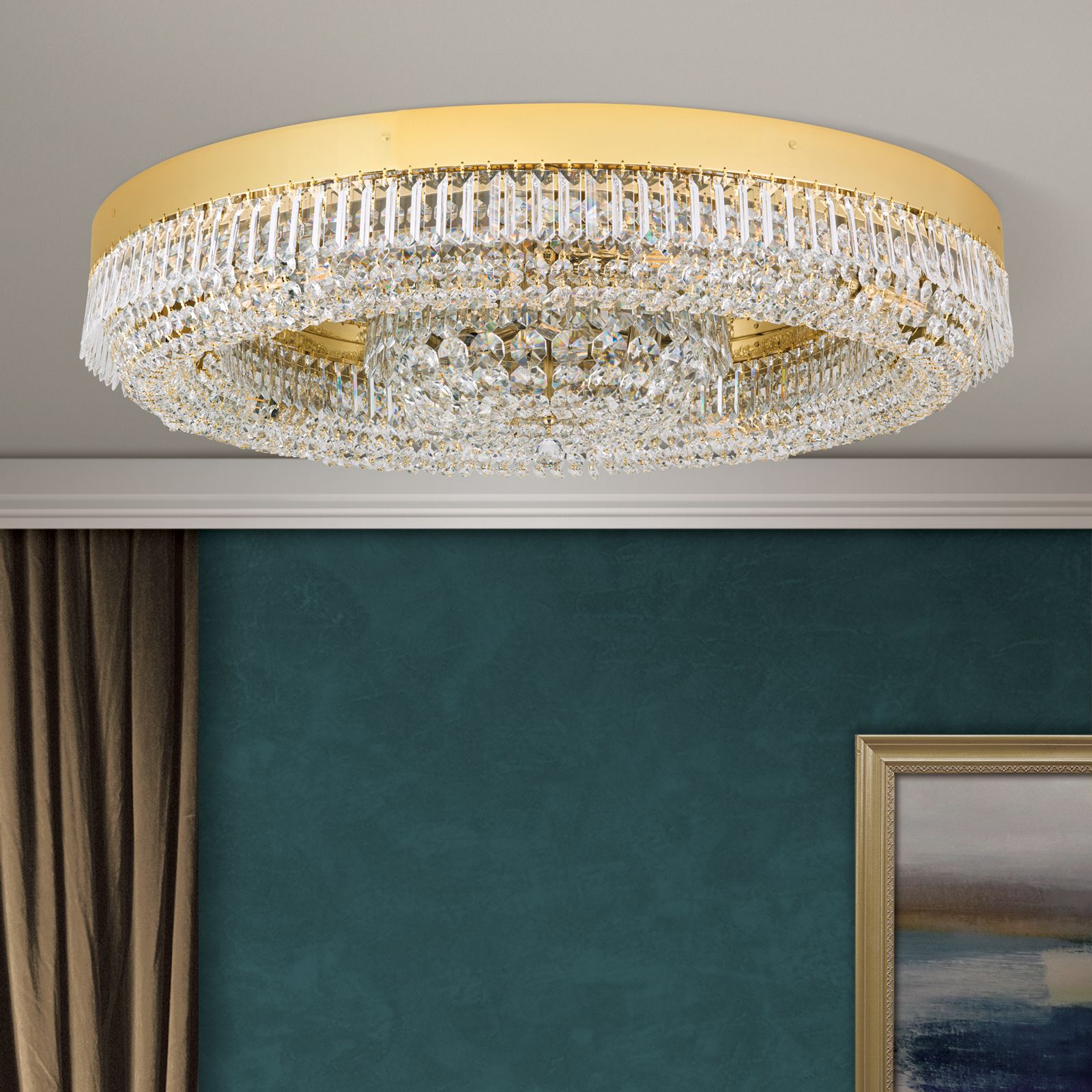 The light has a diameter of 85 cm consisting of a shiny brass plate on which an outer and central crystal ring are fixed. As soon as the light is switched on, the countless SPECTRA® Swarovski® Crystal & SCHÖLER CRYSTAL® crystals bathe the room in a dazzling, glittering and sparkling sea of light. Equipped with 11 E14 sockets for 40 watts maximum each. With the help of a dimmer, light brightness can be adjusted to personal requirements regarding desired ambience.