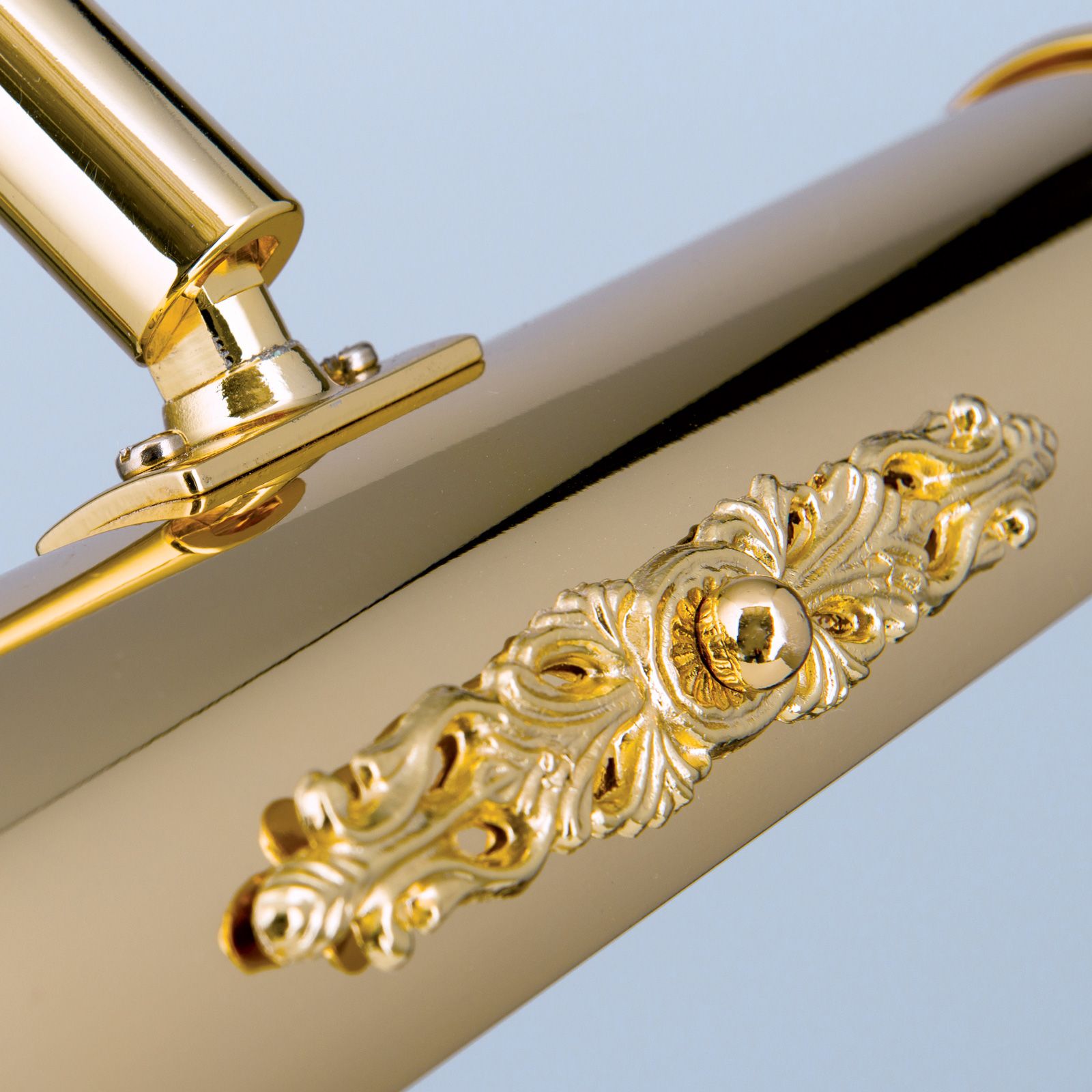 Nostalgic table lamp BILDERLEUCHTE enchants with its graceful and exclusive design. The base, frame and shade are made of solid brass and elaboratedly decorated. The narrow shade is refined with ornamental decor intensifying the light's stylish effect.