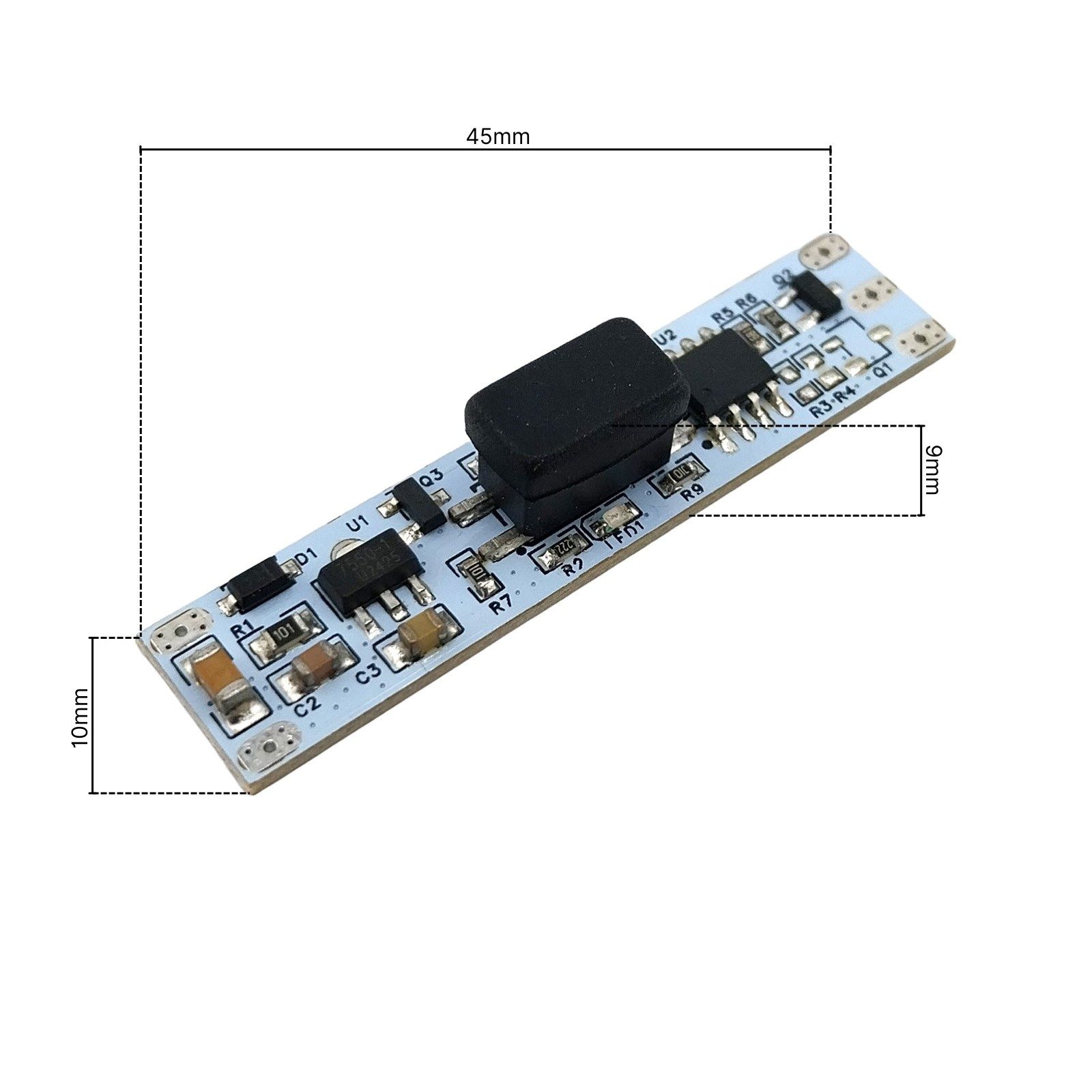 - Length 45 mm, width 10 mm, height 9 mm