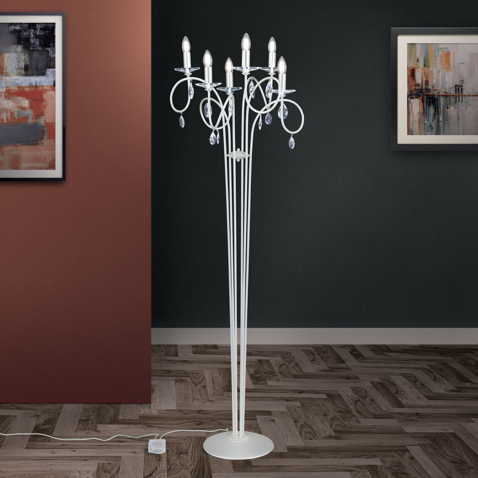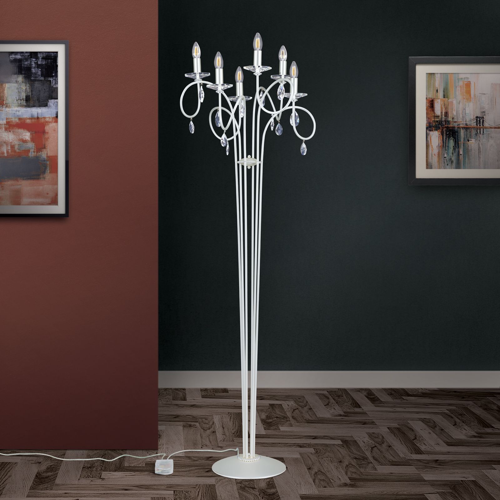 Magnificent floor lamp GIADA exudes quality, elegance and high-quality workmanship consummate for classically designed living rooms. It not only generates an abundance of light, but also acts as noble design element. Special feature are the curved tendrils with 1A full-cut drop catchers and crystal drops as the radiating light makes them sparkle.