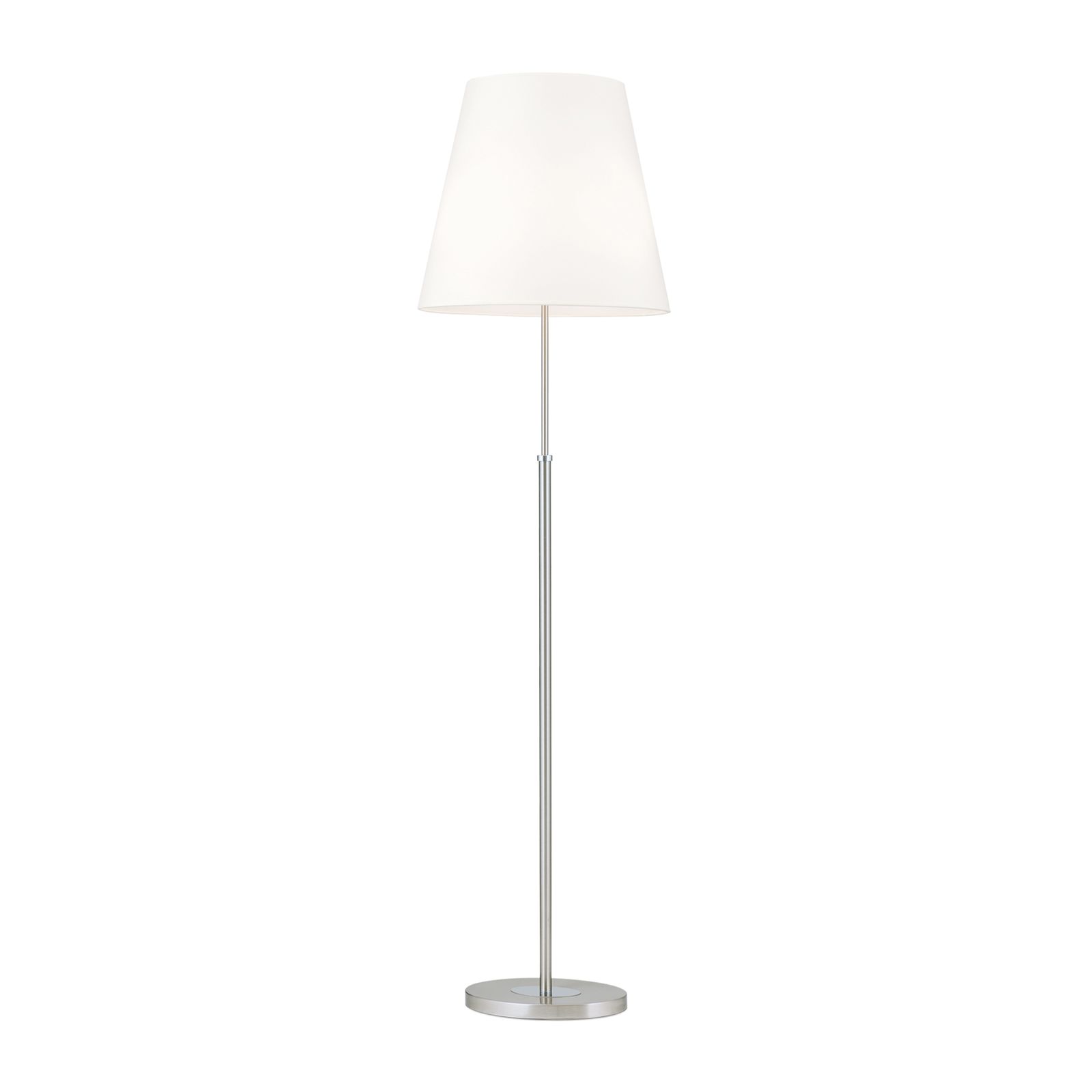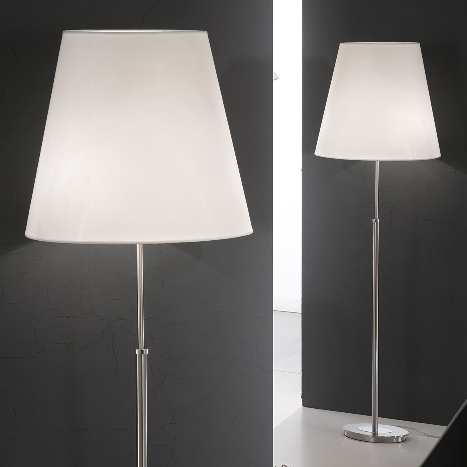 A satin finish refines the metal lamp's body combined with a beige cotton, conical shade. The floor lamp is equipped with two E27 sockets for maximum 60 watts per socket. When fitted with economical LED lamps, it is perfect for energy-efficient, permanent lighting. Matt white lamps are particularly suitable to create a cosy atmosphere in the living or bedroom together with the cream-coloured shade, . The floor lamp is operated conveniently with a foot switch on the transparent cable.
