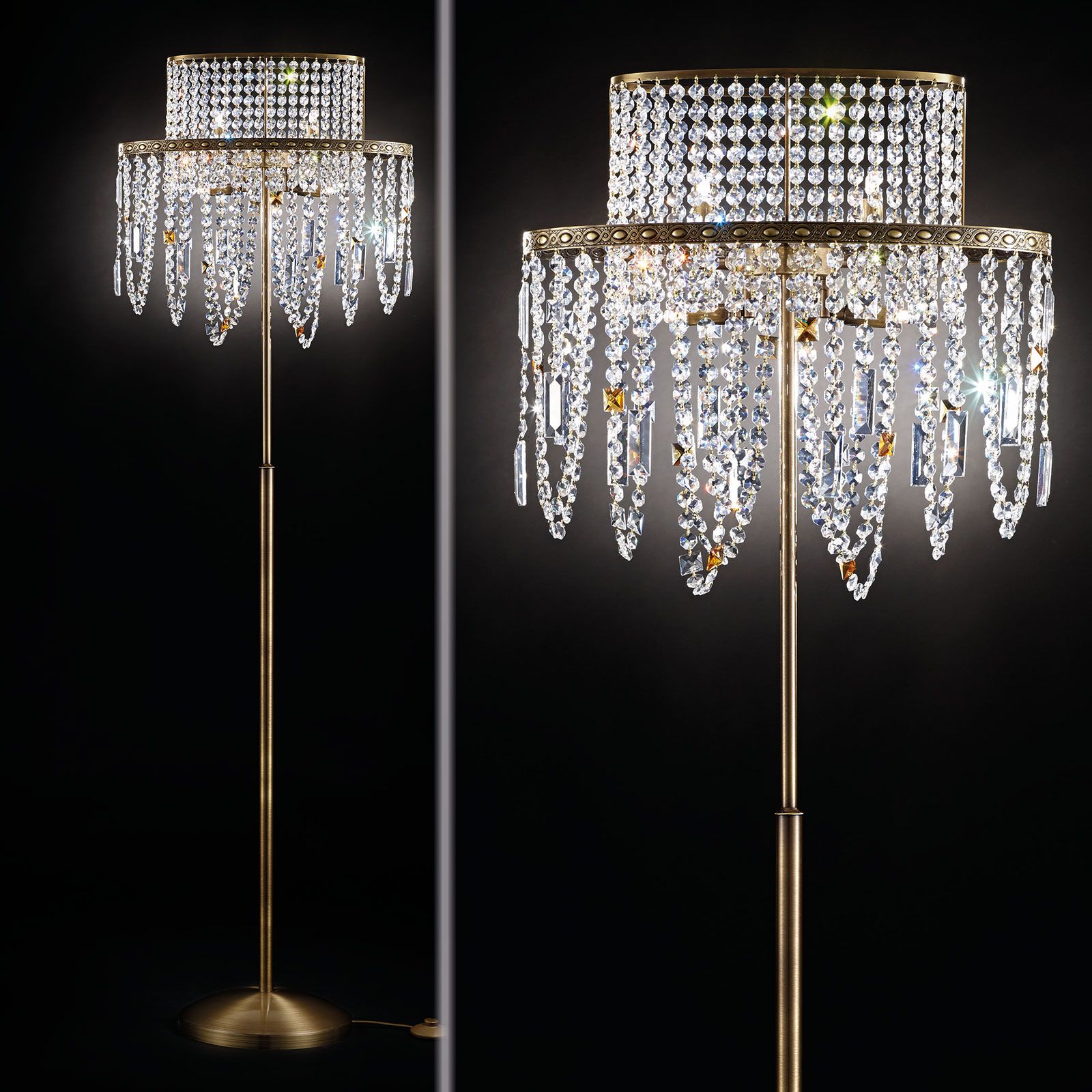Floor lamp KRISTALLDESIGN has a highly attractive presence as an eye-catching furnishing element. It integrates particularly well into classically furnished living rooms, where it can be placed as pleasant accent lighting for a chat in the living room. The stand as well as the two brass rings have a patina finish with numerous SPECTRA® Swarovski® Crystal & SCHÖLER CRYSTAL® crystals attached to them. Hidden behind them are 4 G9 sockets that can be fitted with a maximum of 40 watts.