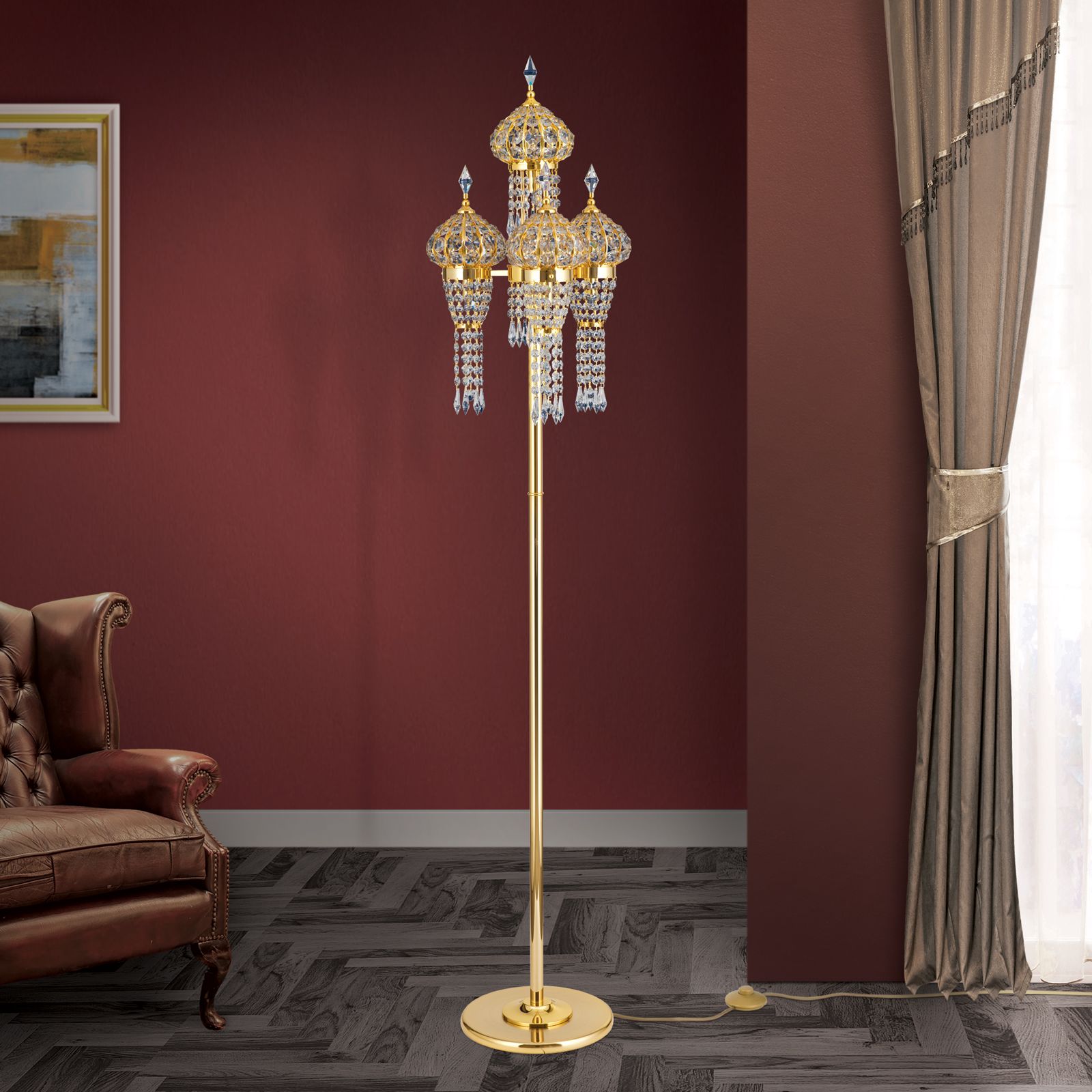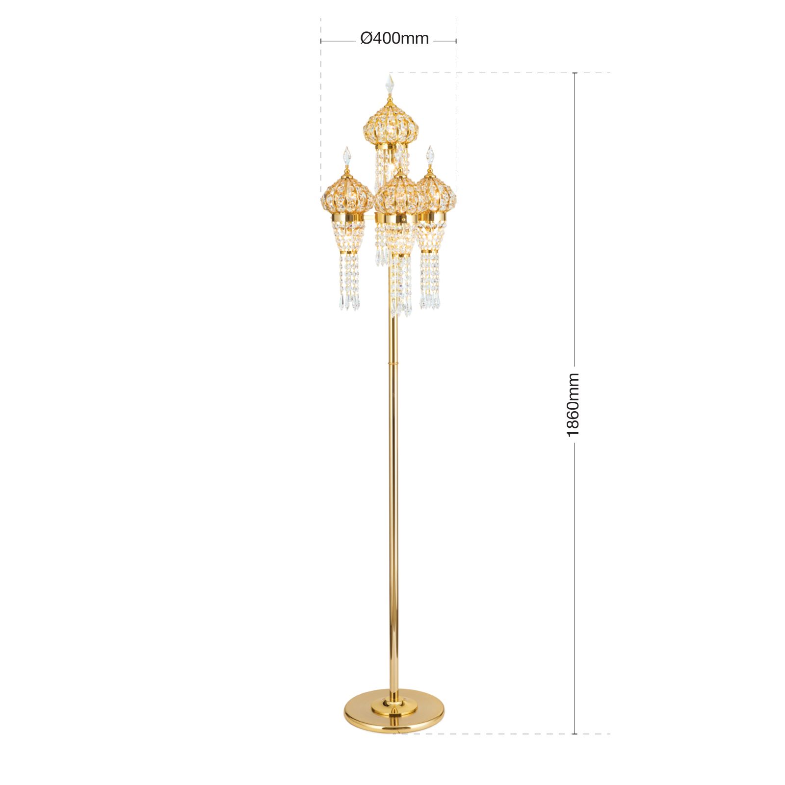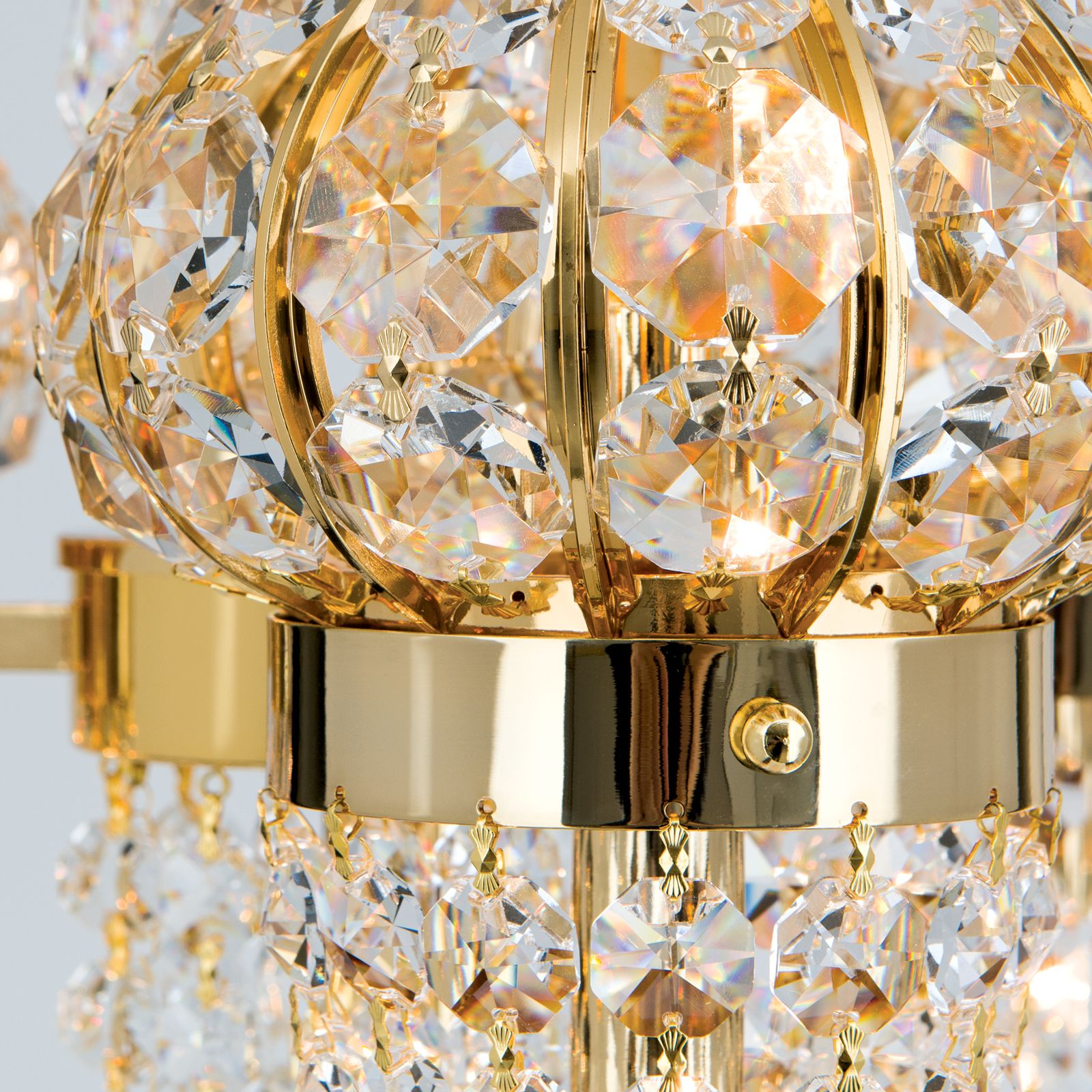 The floor lamp is made of solid brass and then gilded with 24 carat gold. The illuminants are covered by countless differently cut SCHÖLER CRYSTAL® crystals, so that impressive light reflections are created by light refraction. In addition, individual beautiful clear crystals crown the crystal domes.