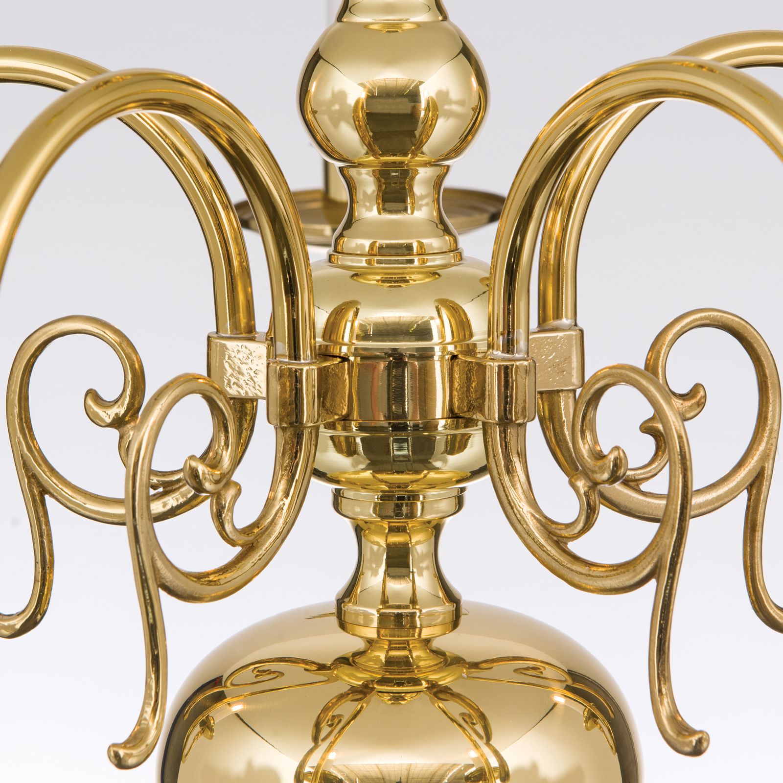 The classic Flemish chandelier is the highlight of brass craftsmanship. Chandeliers made entirely of the precious material have a characteristic matte gold glow, which is enhanced by floral shaped decorative elements.