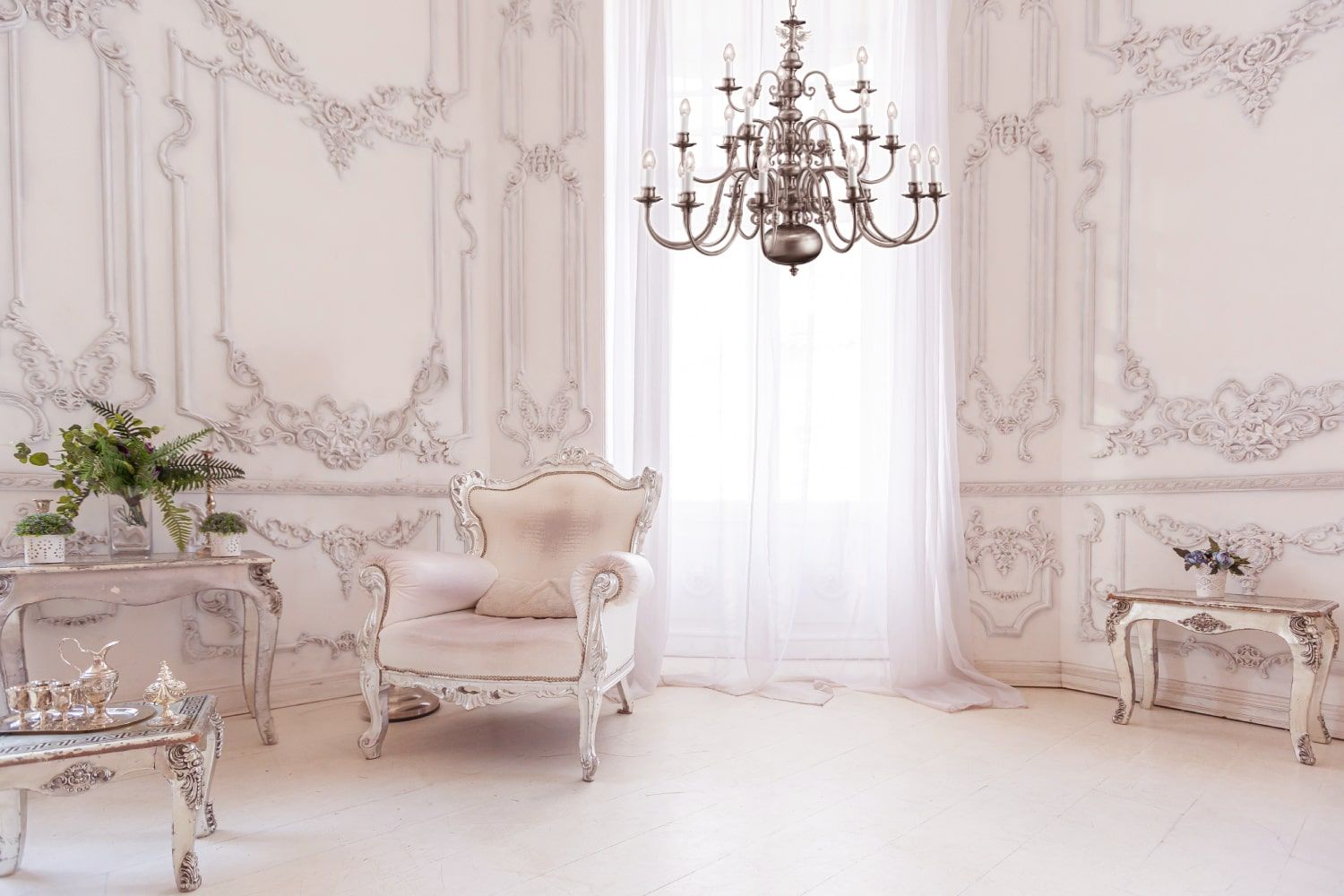 Baroque chandelier creations fit perfectly into great room heights, stucco decoration on ceiling and walls, with tapestries and flowing fabrics surrounding Baroque furnishing elements.