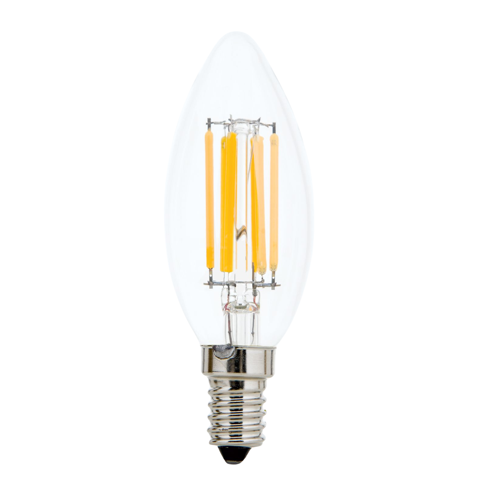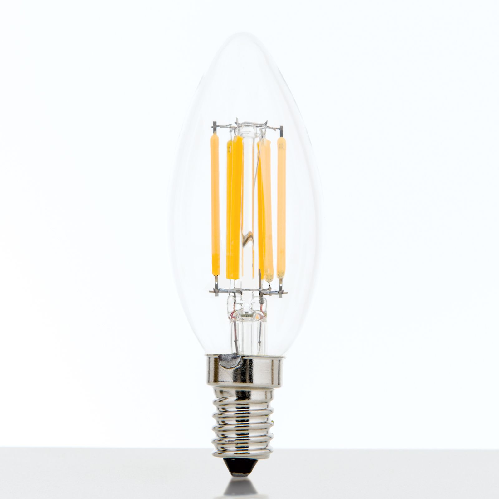 The clear LED lamp in candle shape with an E-14 socket was developed to replace conventional incandescent lamps and offers a light output of 470 lumens. It emits warm white light (2700 K) and is dimmable.