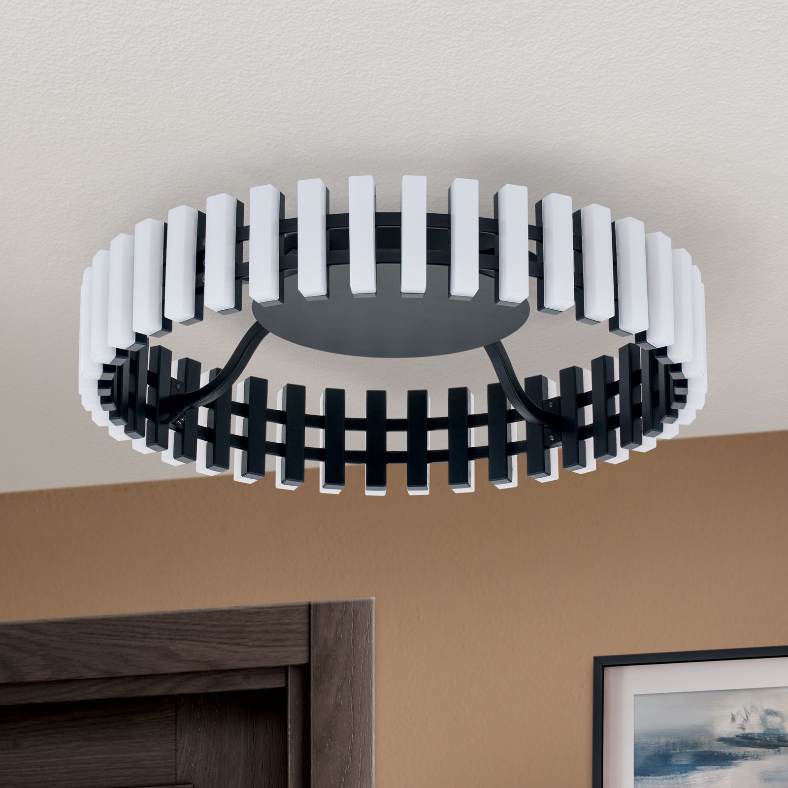 If you are looking for an unusual ceiling light, you will certainly find it in the MANSION series. LED ceiling light MANSION impresses with its extremely modern and futuristic design, making it ideal for modern furnished living rooms. Due to their shape and color, the black and white light elements are reminiscent of a keyboard and offer a contrasting interplay. With 3000 Kelvin, MANSION emits warm white light, which can additionally be regulated in brightness with a phase cut dimmer or LED dimmer. Equipped with modern LED technology and a light output of 2240 lumens, the ceiling light perfectly illuminates the desired area. The LED boards in the light elements can be replaced by yourself if necessary.