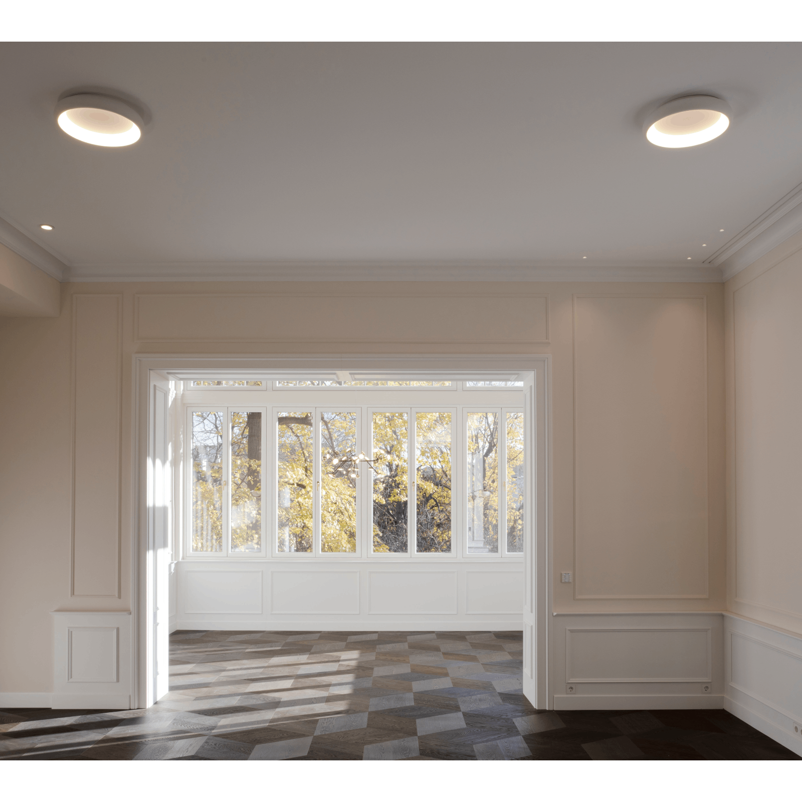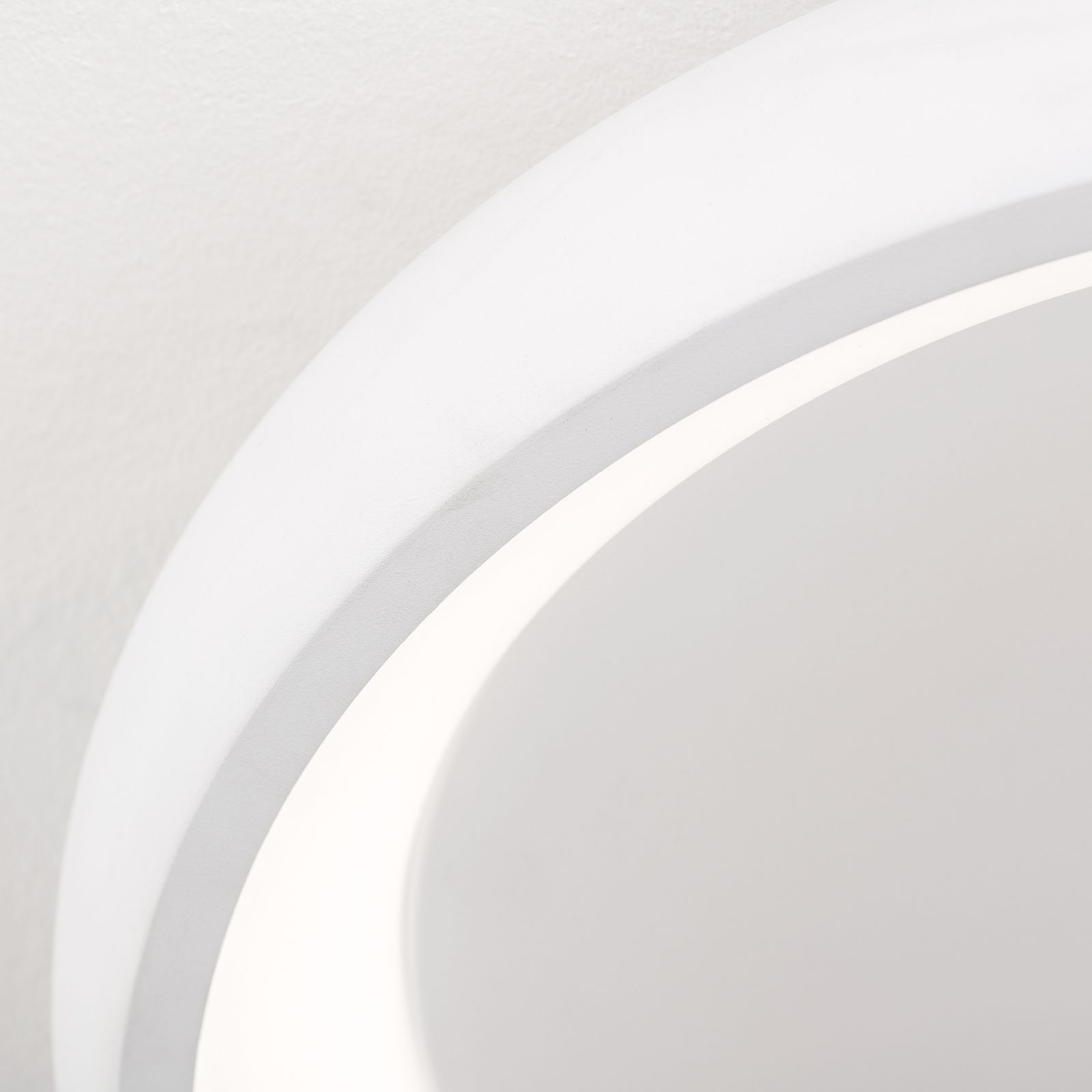 The VENUS series offers ceiling lights in three different diameters. This white sandblasted light has a diameter of 41 centimetres and is the smallest in the series. The basic geometric form has a calming effect in a room, especially in this limited size. In any case, it will form a harmonious centre around which any type of interior style can unfold. With 1650 lumens, the warm white light creates a cosy lighting atmosphere. Its low height of only 8.5 centimetres makes it ideal for mounting in low rooms.