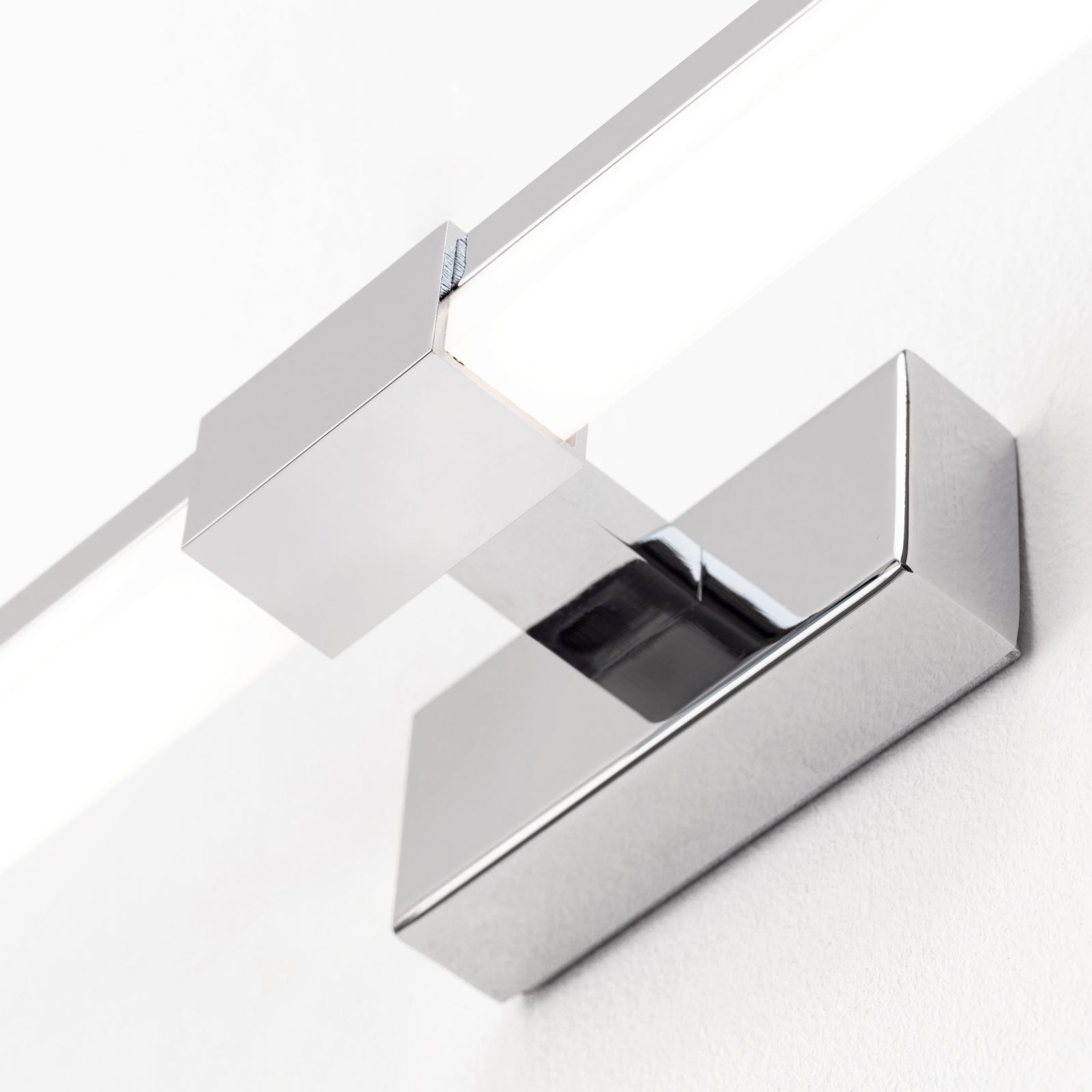 Equipped with 12 watt LEDs and a satinated glare shield, it radiates a pleasant warm-white light. Its cubic chrome elements set minimalistic accents and a depth of only 8 cm lets it blends into the room without being overbearing.