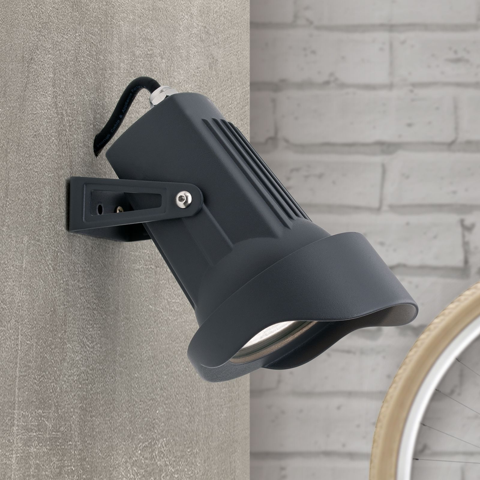 The light has decorative ribs on the upper side, that serve to optimise heat radiation during continuous use. It can be swivelled and is equipped with a rain shield.