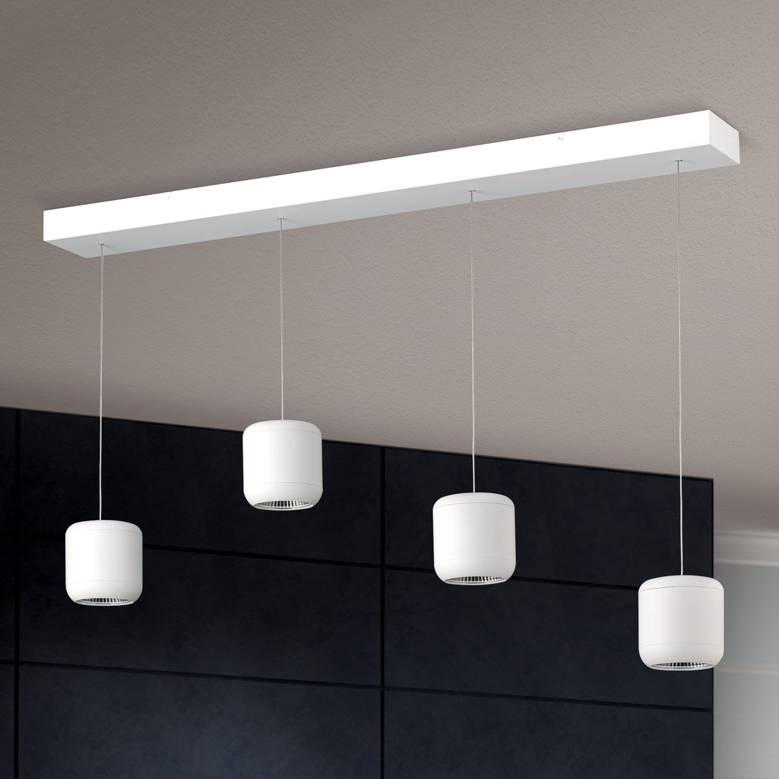 Pendant lamp SHUTTLE permits different lighting designs since the four individual cylindrical are height adjustable: If all lights are set on the same height, the area below is evenly illuminated. If the heights are adjusted at varying heights, individual elements such as a vase, the table centre or its edges can be emphasized. The individual spots' clever design with their gently rounded cylinder ends give it a harmonious overall impression. The pulley system with fine steel cables underlines the design's high quality and modernity. The total output of 2400 lumens requires only 40 watts. The light is warm white (3000 Kelvin) and can be dimmed with a phase cut dimmer.