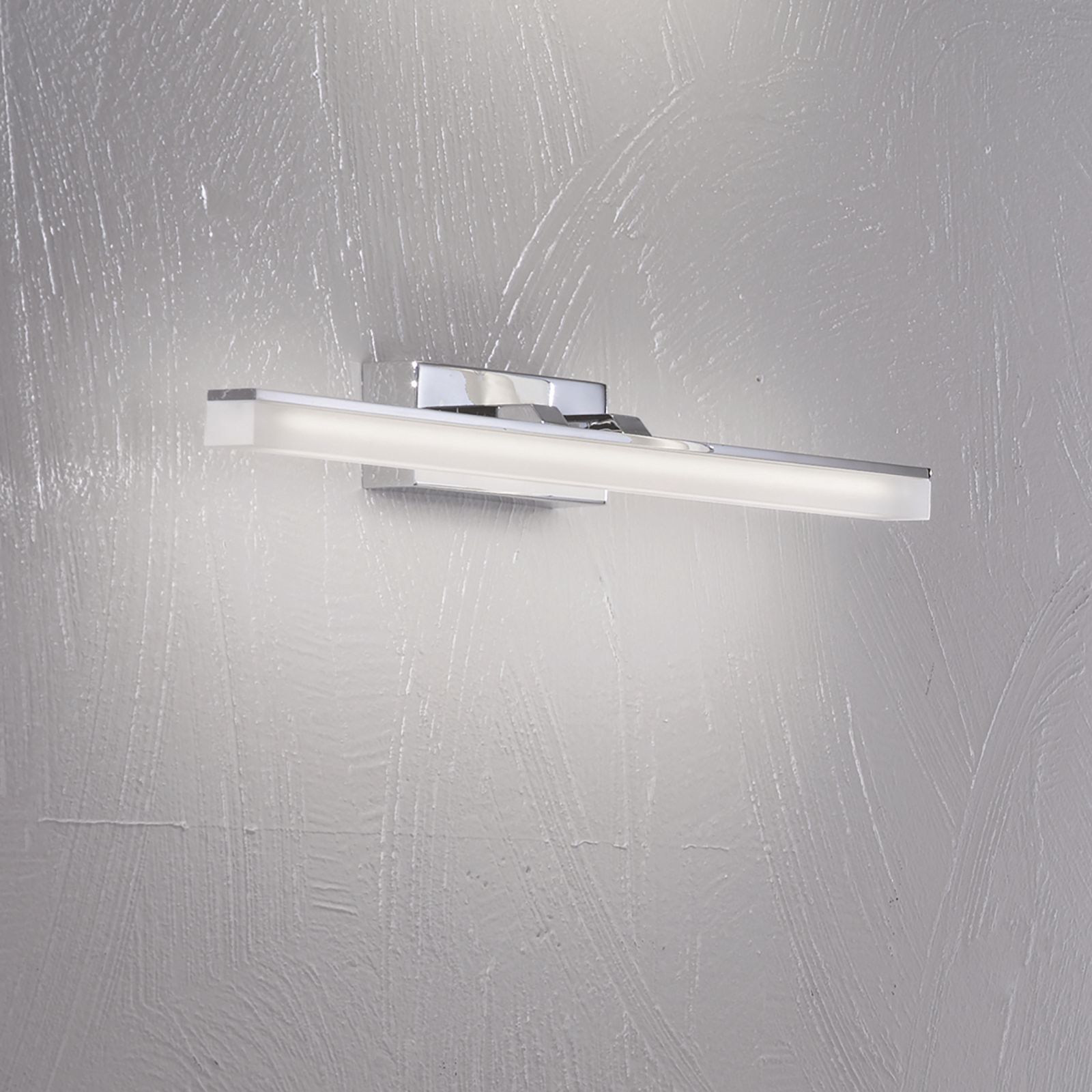 Mirror light LEDINA looks puristic and elegant. With 900 lumens, the discreet, horizontal wall light is a small power package that provides plenty of brightness in bath- or restrooms. Its shade made of durable, satinated acrylic glass radiates the light evenly downwards without dazzling.