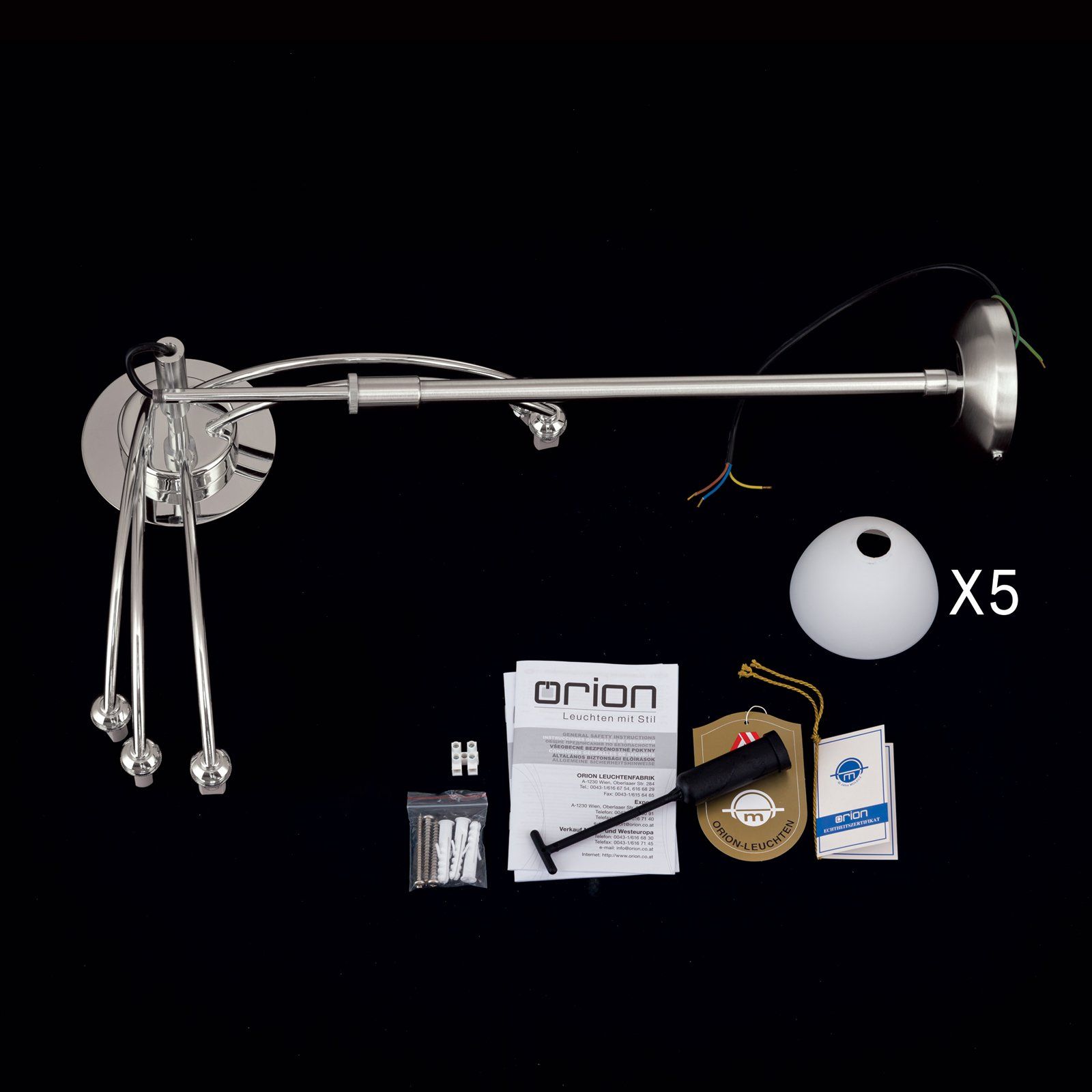 OPALDESIGN chandelier, 5 lamps, satin chrome with opal glasses