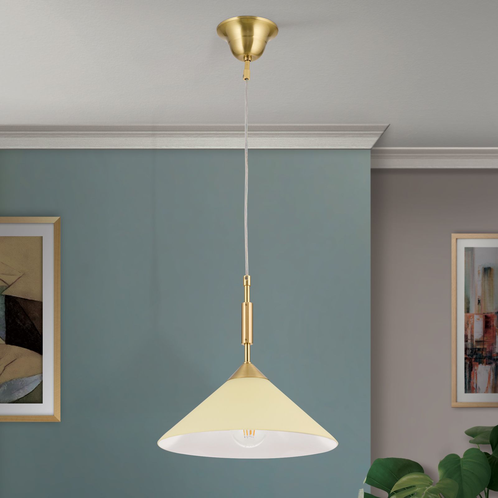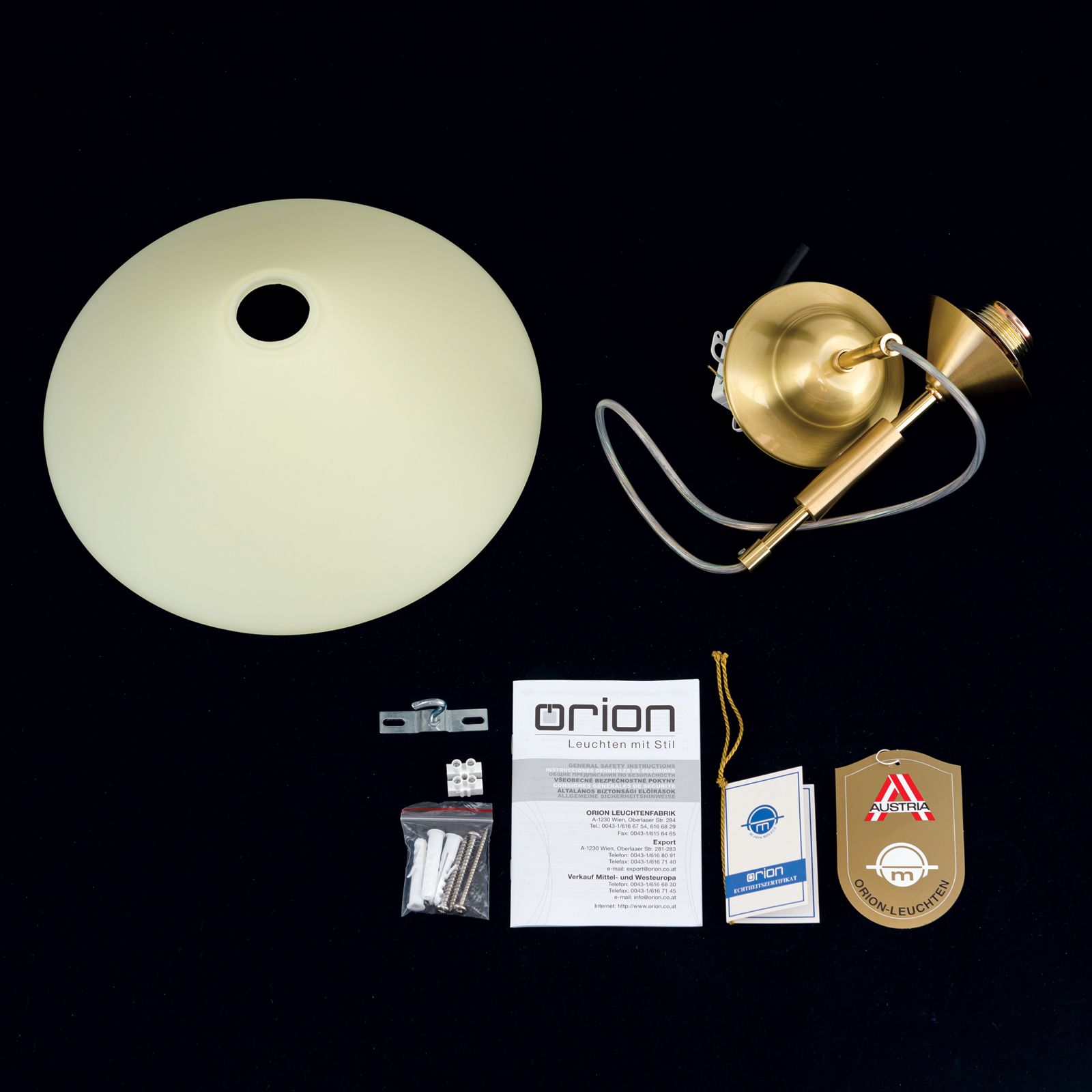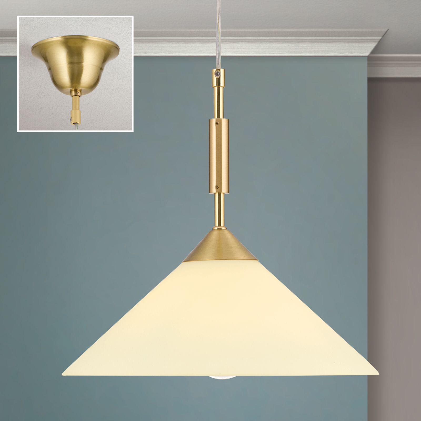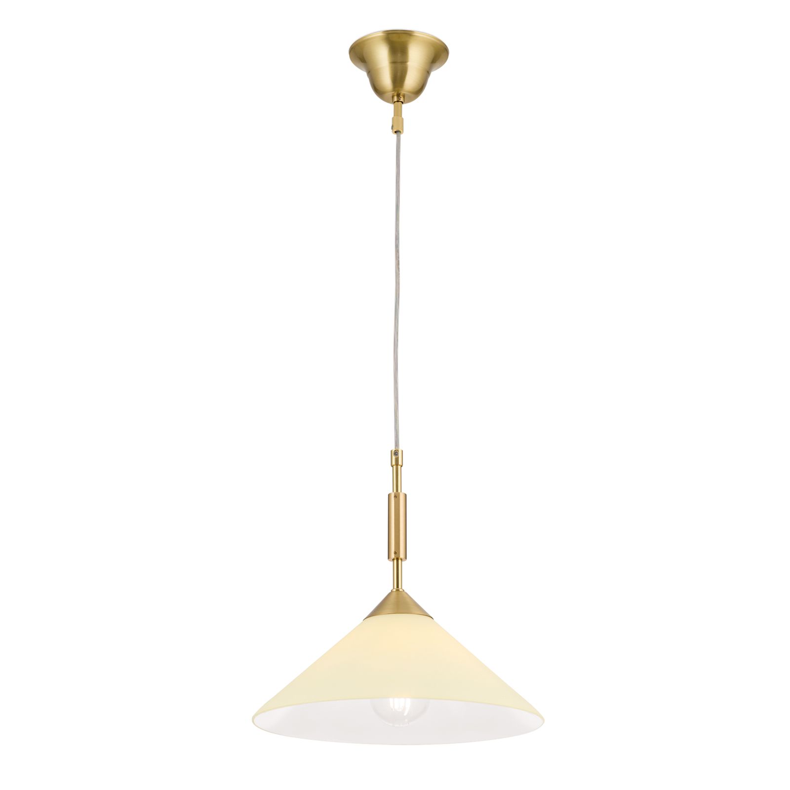 A flat cone shade made of satinated glass and a brass socket form the basic components of 1-flame pendant lamp ARTDESIGN. It can be integrated into almost any colour and furnishing concept and radiates pleasant light into its surroundings and downwards. Thus, it is ideal for illuminating tables or counters and ideally fitted with mirror head bulbs that protect against glare.