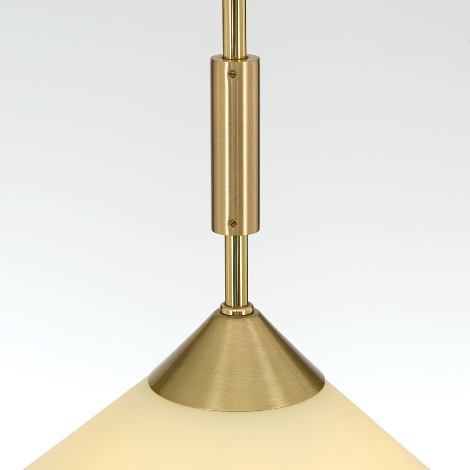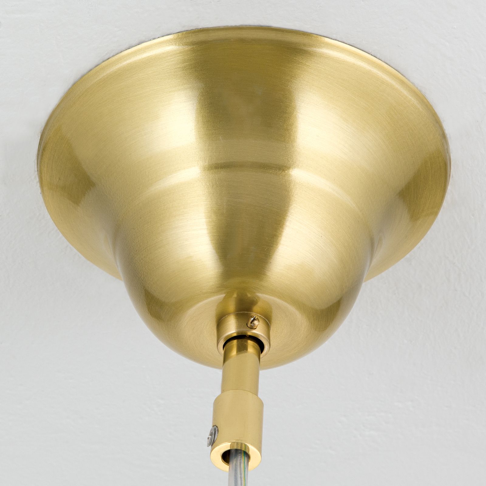 A matt brass finish refines the luminaire's solid brass frame combined with a champagne-coloured glass shade. Also available is satinated finish with an opal glass shade. The pendant lamp is equipped with an E27 socket and can be fitted with 75 watts maximum.