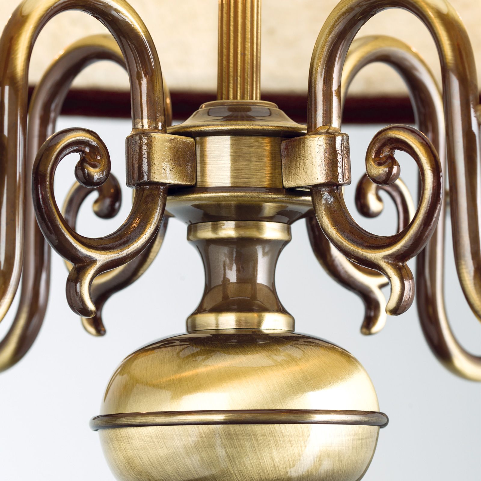 The 4-lamps pendant lamp is modelled after Fllemish Baroque chandeliers. The shade has the additional function to softly and evenly diffuse light. The individual sockets are designed in candle look. The bobeches are artfully connected to the central column via S-shaped arms. Restrained, dignified decorations, tendrils and fluting round off the antique look. Parquet floors, muted colours, flowing fabrics, soft carpets and the warm light of this pendant lamp form a pleasantly relaxed unit.