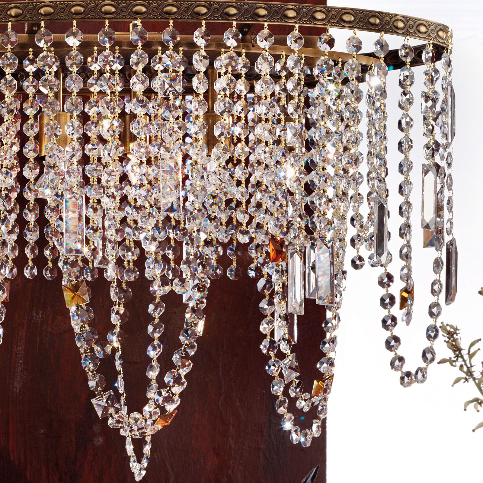 SCHÖLER CRYSTAL® chandelier crystals give the pendant lamp from the KRISTALLDESIGN series a classic yet unique character with a versatile range of installation options. Due to its oval shape, it is perfect for mounting above dining tables, but also as effective illumination in hallways. The brass frame with a total length of 120 cm and width of 34 cm consists of 2 ornate rings, each embellished with countless clear crystals providing breathtaking light reflections. In addition, amber-coloured square crystals are attached to the crystal chains at different lengths to establish a colourful connection to the patinated mounting perfectly rounding off the design.