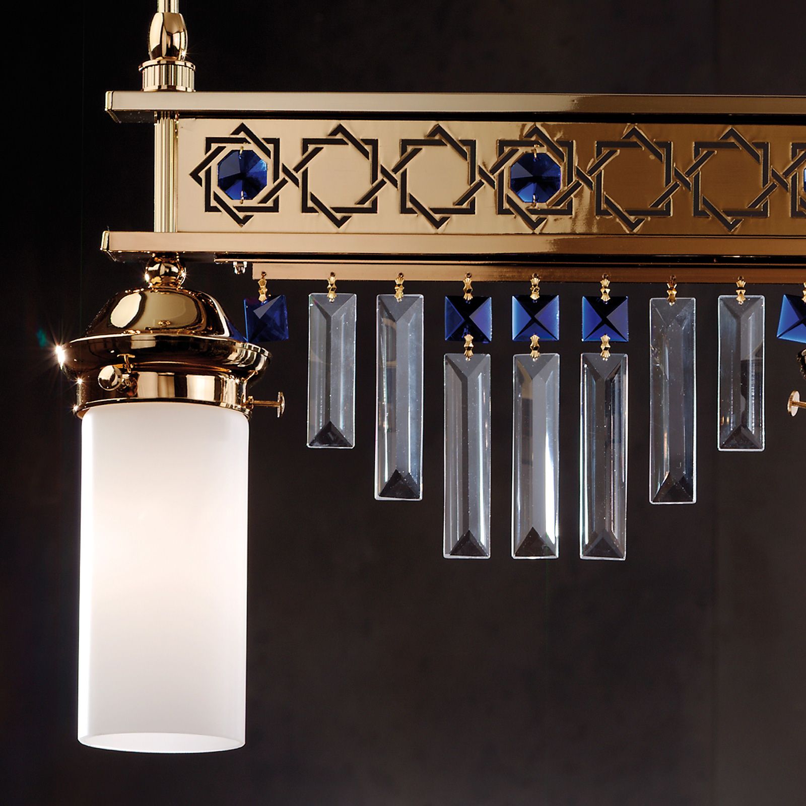 The 4-flames ceiling chandelier from the ORIONtal series dives into the splendour of Arabian Nights. Gilded trims enchant with typical oriental infinite patterns. Inlaid crystal caps sparkle glowingly on the gold. The hanging with blue prism-cut crystals fans out light rays in all the colours of the rainbow. Matt glass shades spread a cosy atmosphere and soft, warm light. Due to its longitudinal alignment, this light is ideal for elongated rooms such as long corridors or anterooms. Or expansive dining hall tables can also be optimally supplied with light. The pendant lamp has four E27 sockets for up to 60 watts each.