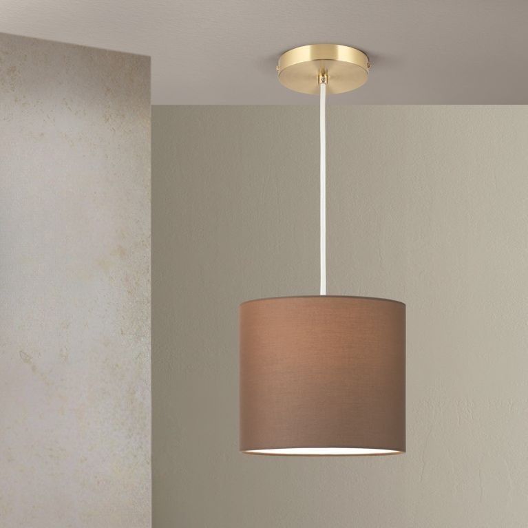 Pendant lamp SHADE, small, brass matt, with cylindrical, brown shade, 1x E27