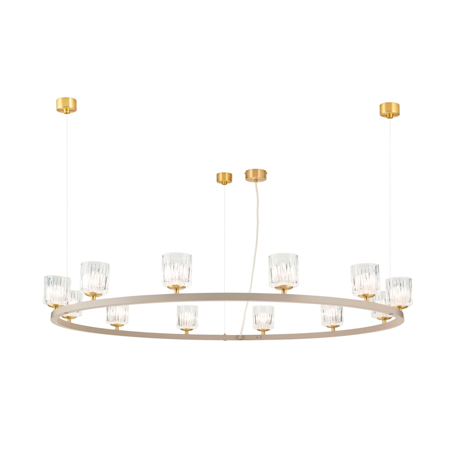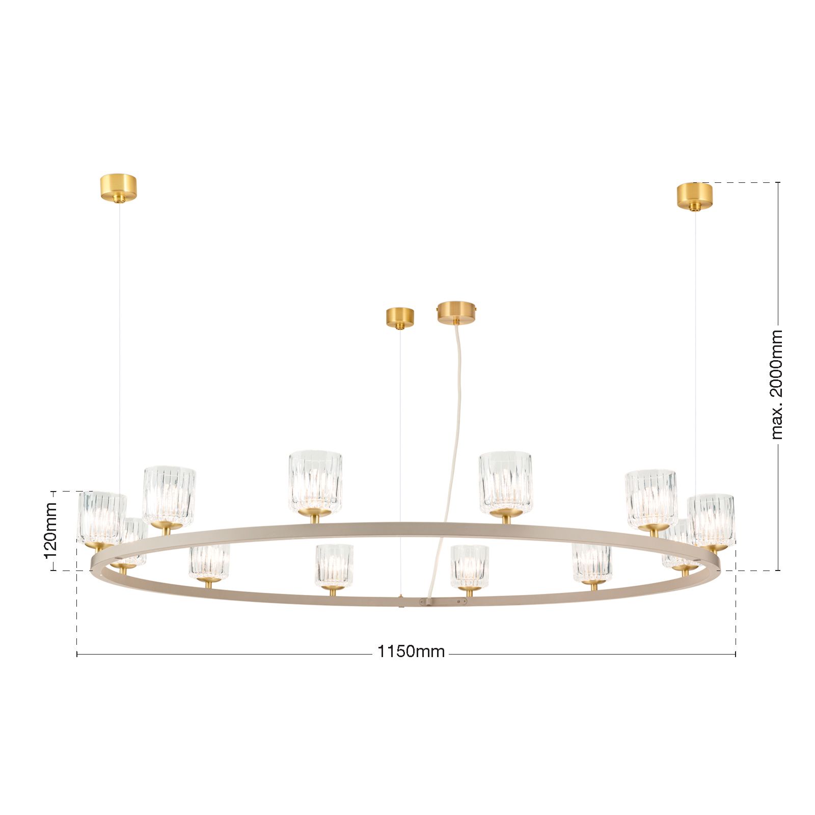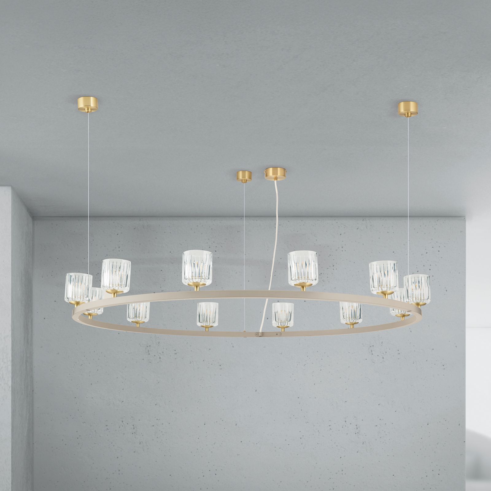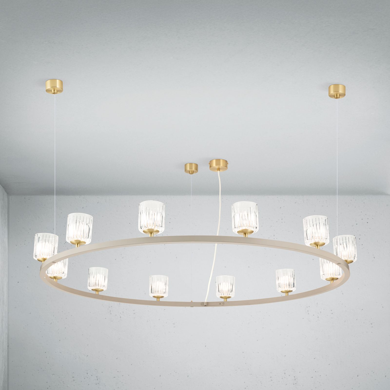The TUMBLER pendant light combines modern design with classic, timeless elegance and makes a stylish statement in any room. With its generous diameter of 115 cm and twelve upward-facing glass lampshades with an elegant clear cut, it provides pleasant, indirect light distribution and an elegant lighting effect on the ceiling. The filigree construction gives the light a light, floating appearance, while the high-quality materials ensure a durable and high-quality look.