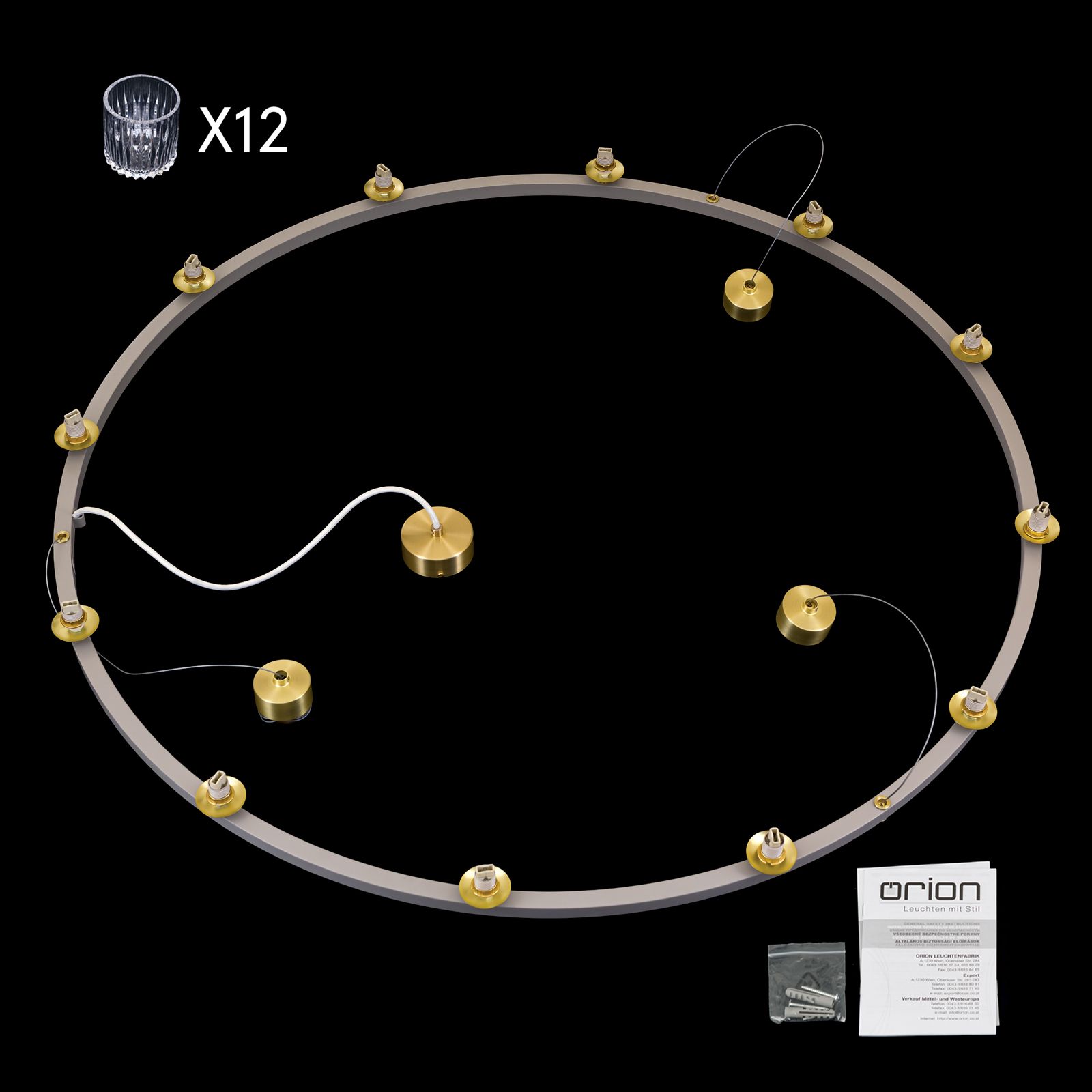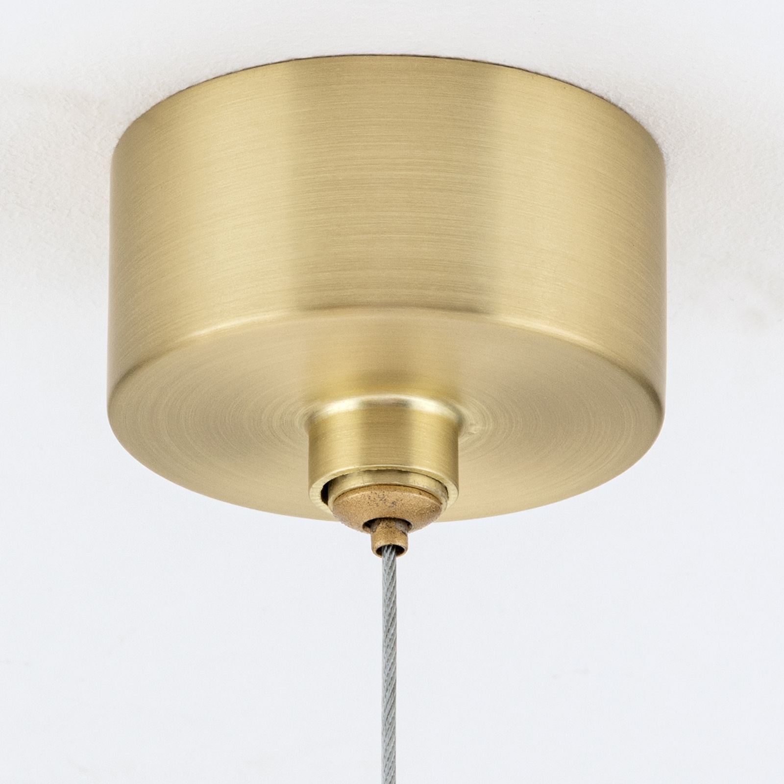 The light is available in three tasteful versions: in matt brass with white cables, in black with black cables or in khaki with white cables. The ceiling canopy is finished in elegant matt brass in all versions and forms a harmonious contrast to the respective colour variant. Equipped with twelve G9 lamp holders, the pendant lamp offers sufficient light output and can be flexibly fitted with suitable light bulbs.
