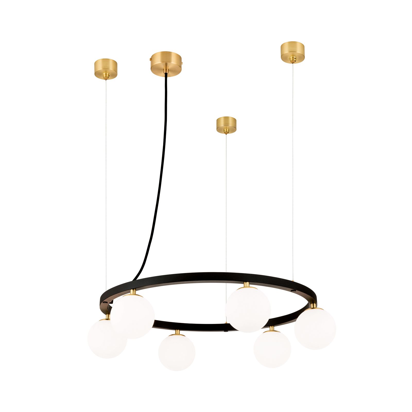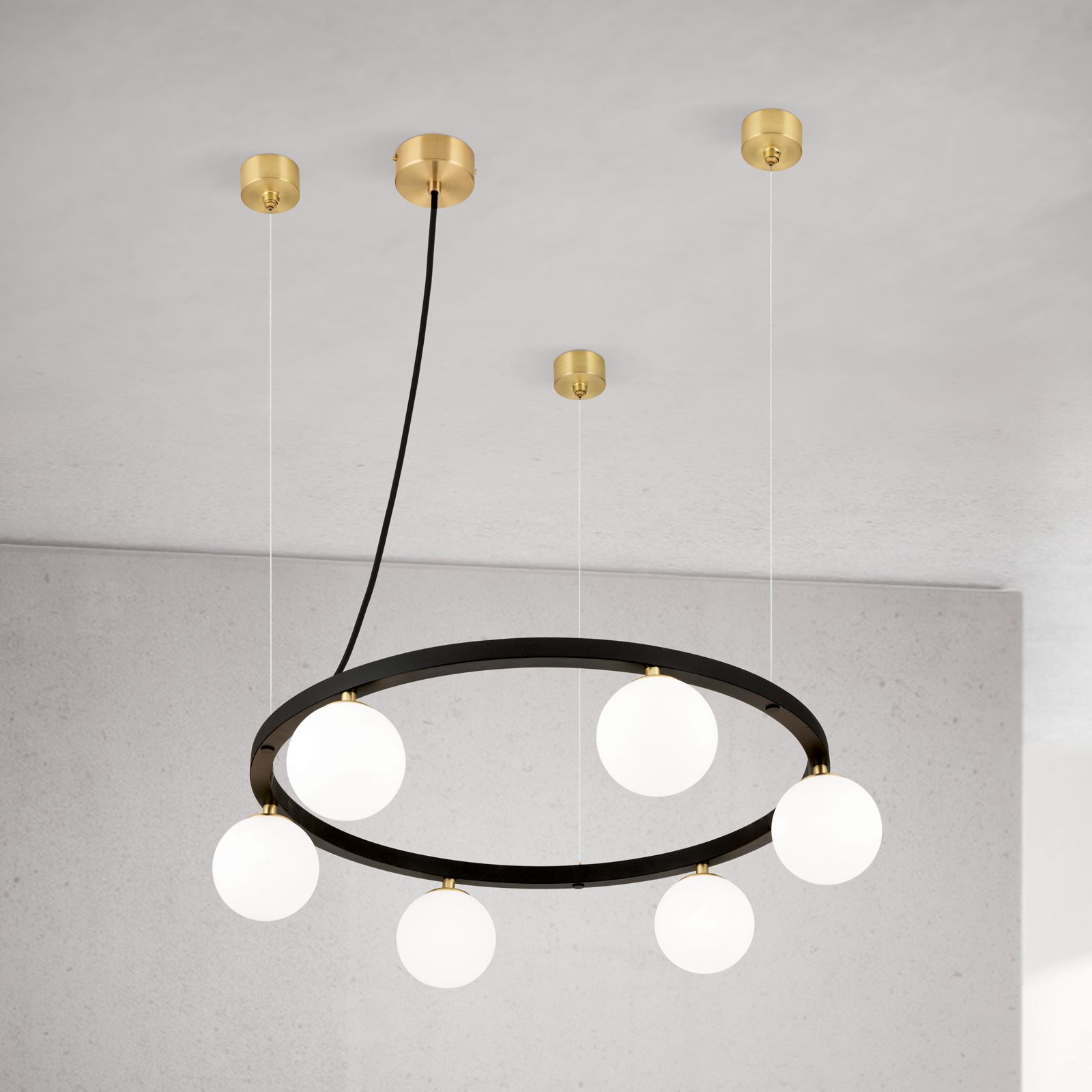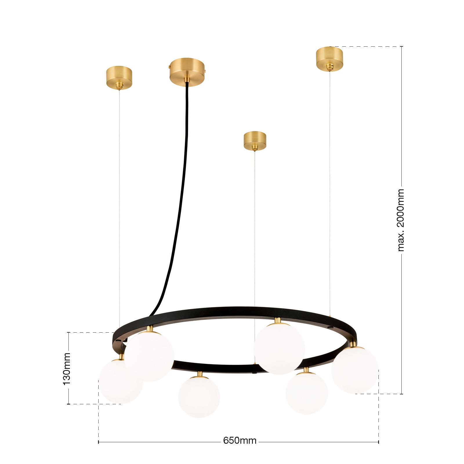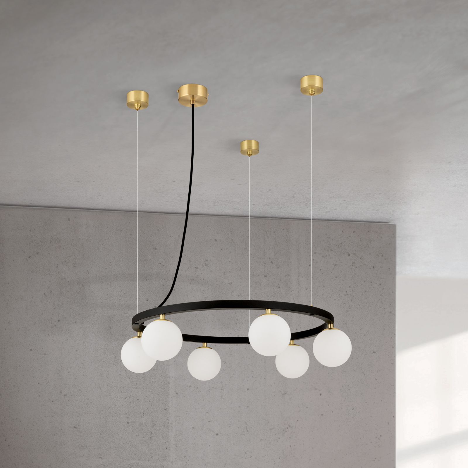 The TUMBLER pendant light combines modern design with classic elegance, making it a stylish eye-catcher in a wide variety of living and working areas. Six harmoniously arranged, round opal glass shades ensure uniform, glare-free light distribution and create a pleasant atmosphere in the room. The downward-facing shades create targeted lighting accents on table and seating areas.