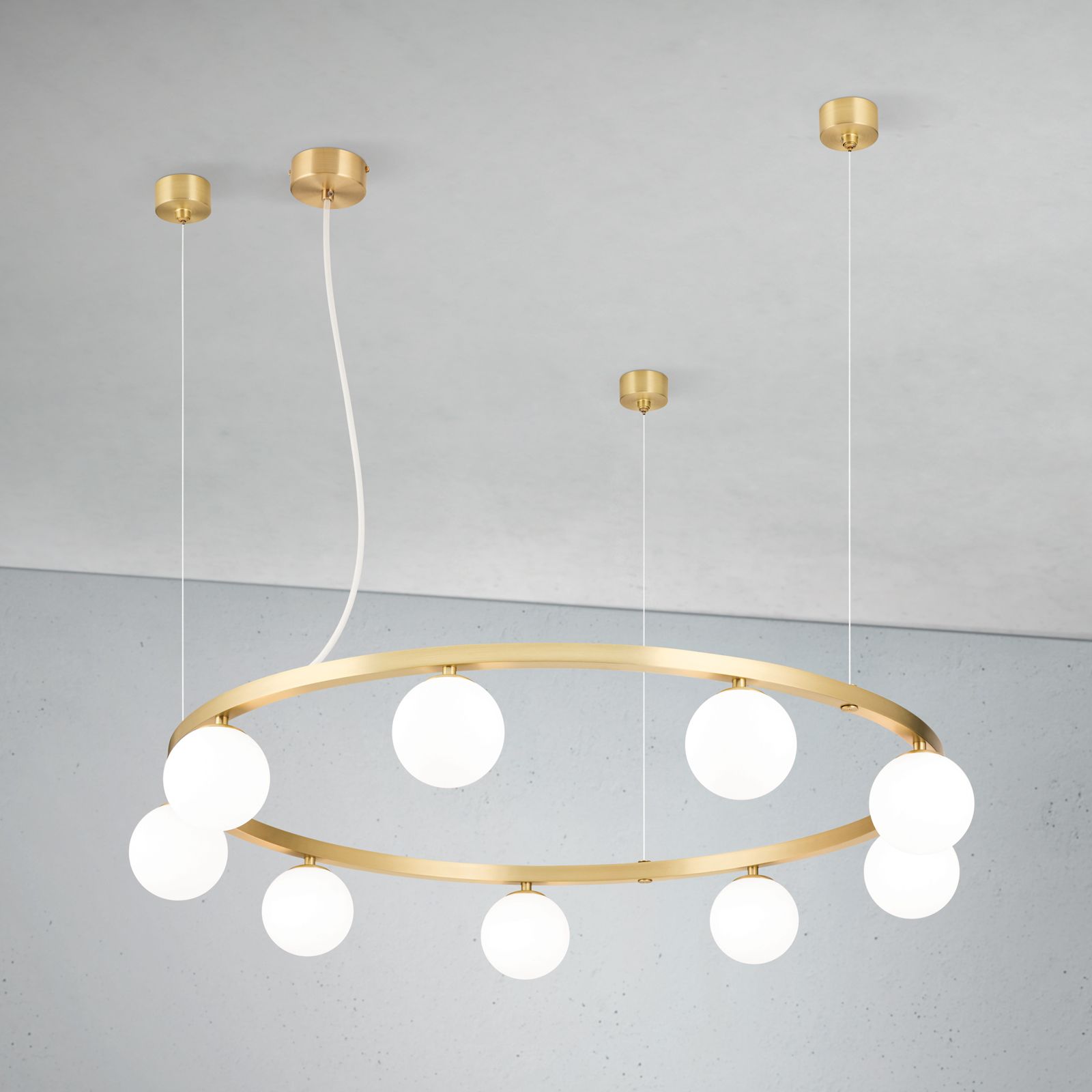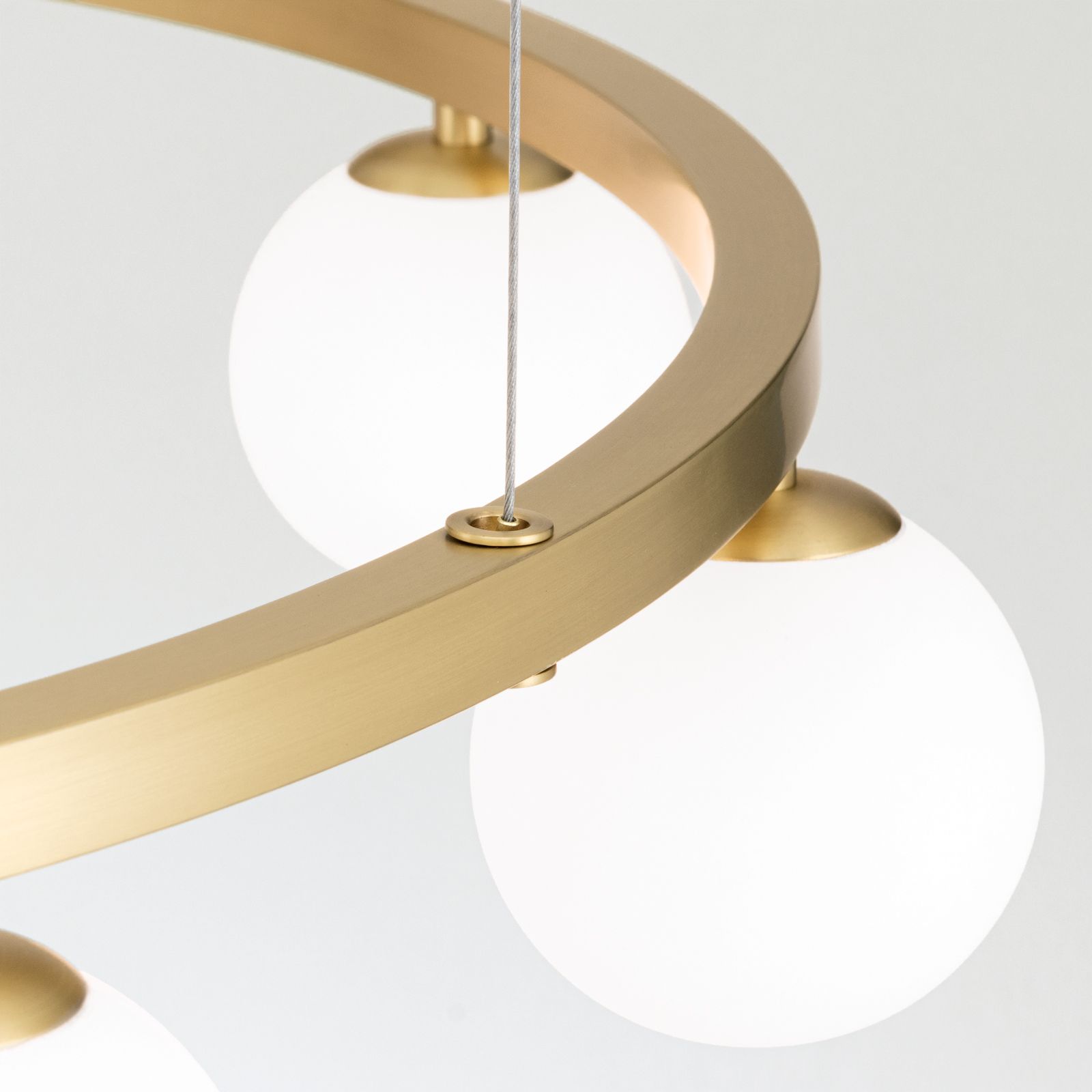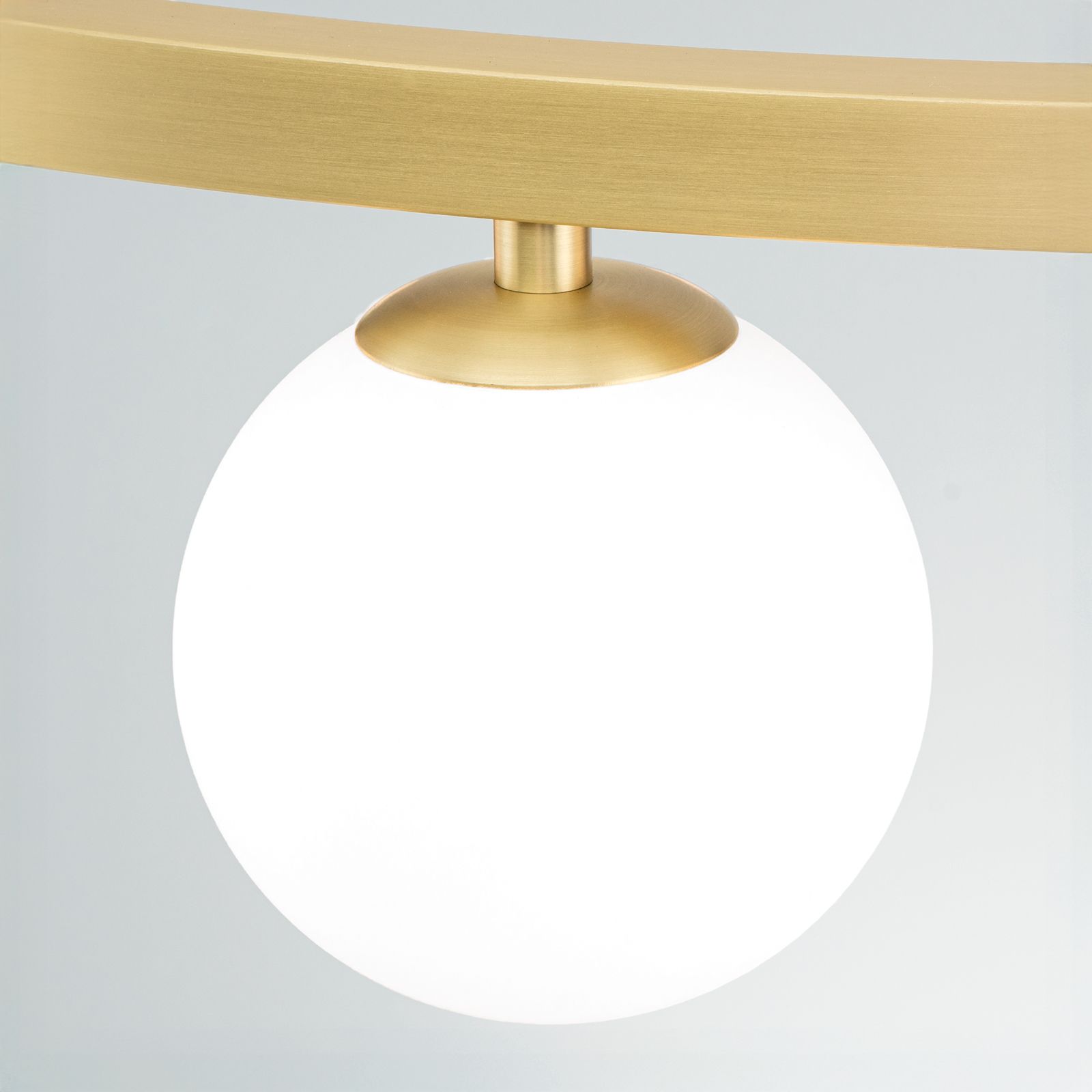The ceiling rose is consistently finished in matt brass on all models and emphasises the high-quality overall impression. The combination of metal ring and opal matt glass gives the light a balanced presence between modernity and classic design language.