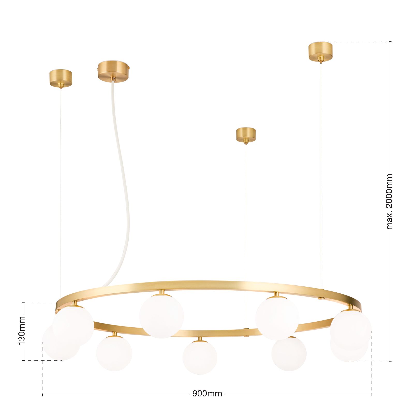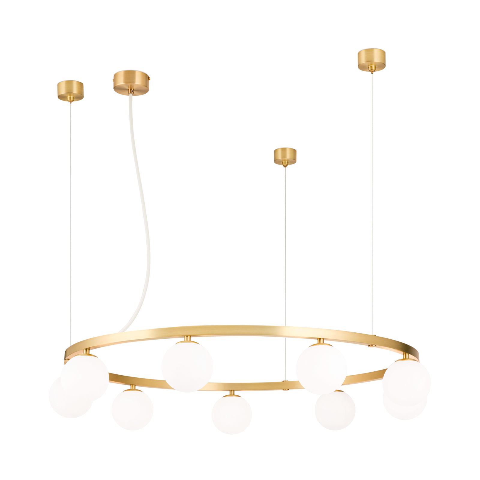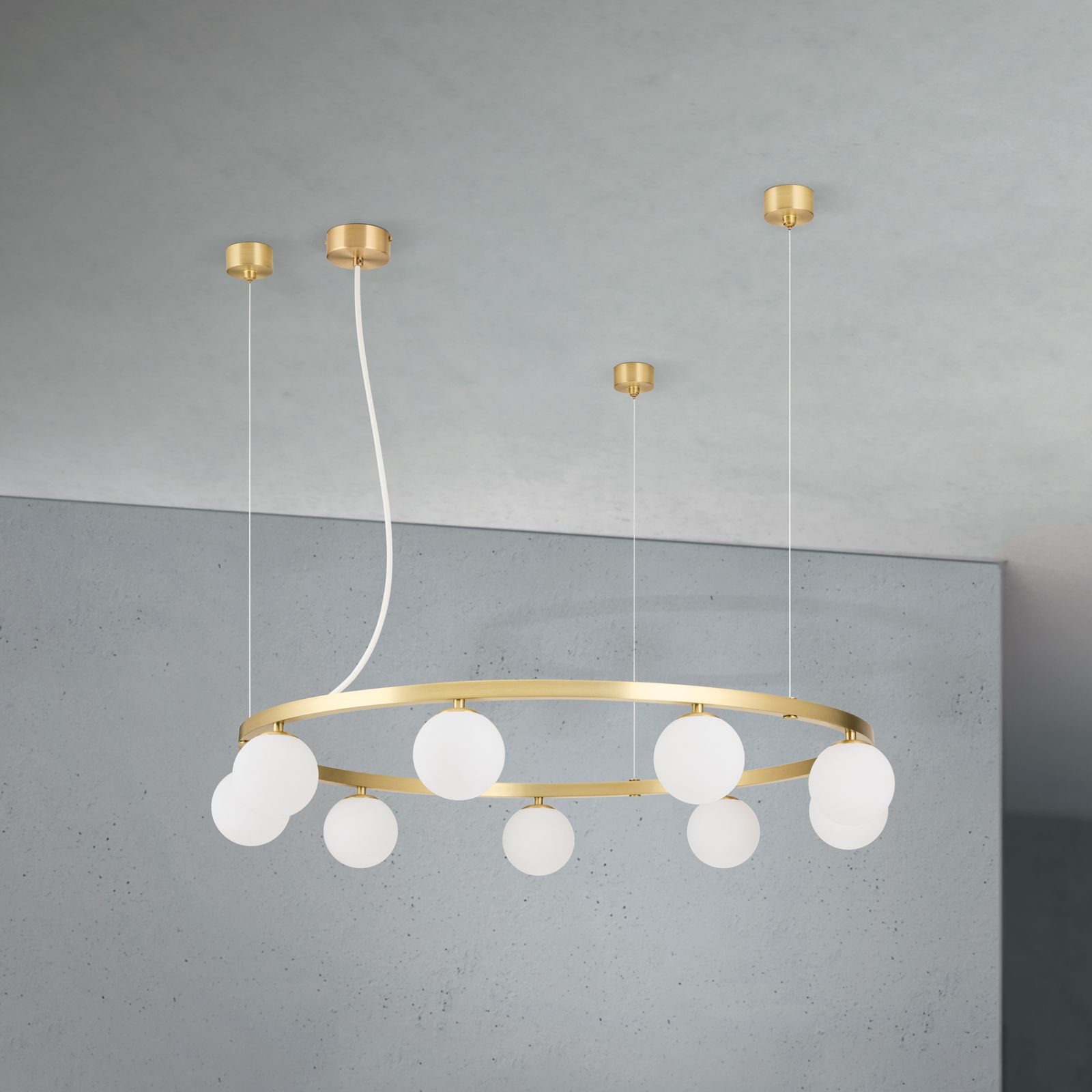 The ceiling rose is consistently finished in matt brass on all models and emphasises the high-quality overall impression. The combination of metal ring and opal matt glass gives the light a balanced presence between modernity and classic design language.