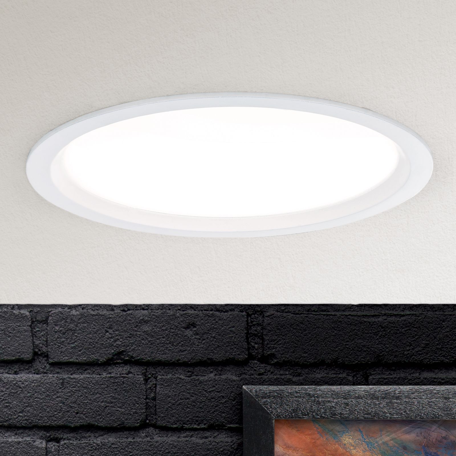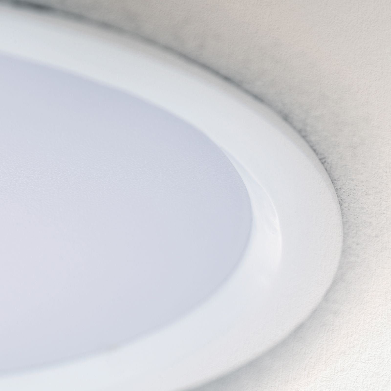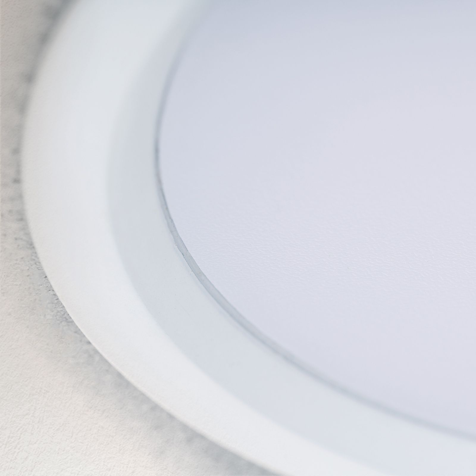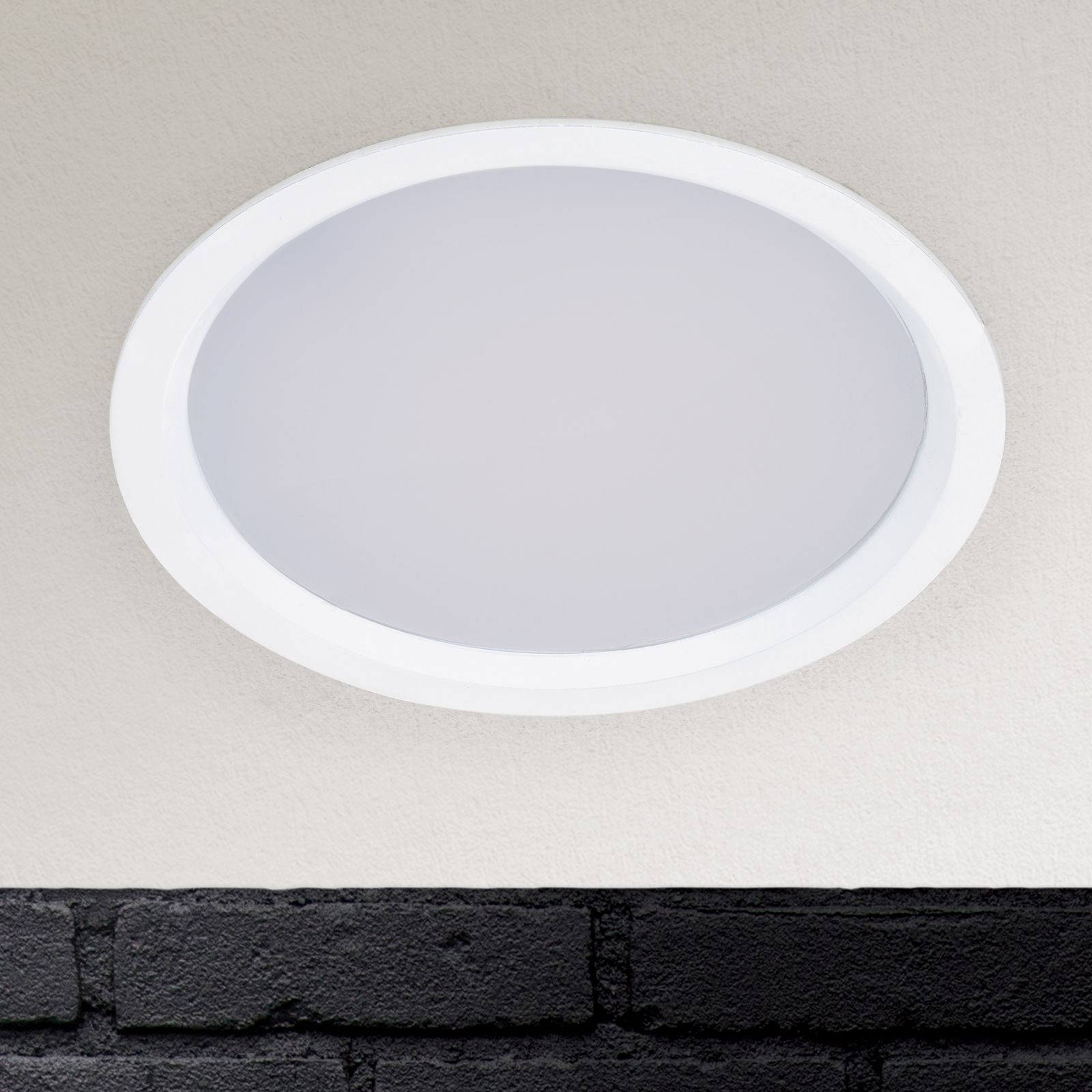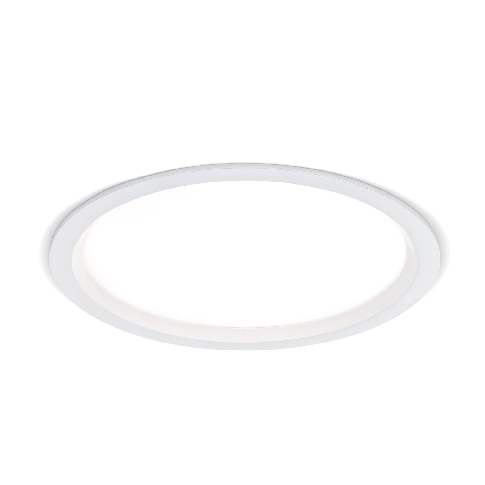 The recessed spotlight of the SPOCK series floats on the ceiling like all galactic objects in perfect roundness. The circular matt glass shade sends out a warm white beam of light to brightly illuminate contemporary living rooms, entrance halls or offices. The frame' cut-out widens outwards, distributing the light generously to the sides. Its recessed depth of only 4 centimetres permits its installation in rooms with suspended ceilings of low height. An LED illuminant supplies 1850 lumens with a consumption of only 24 watts.