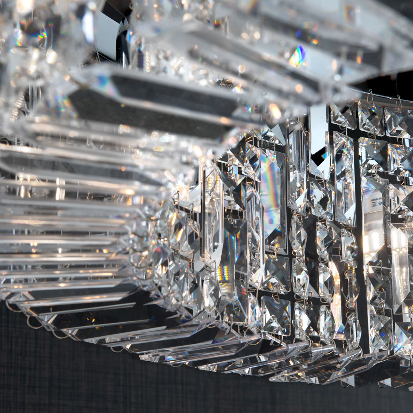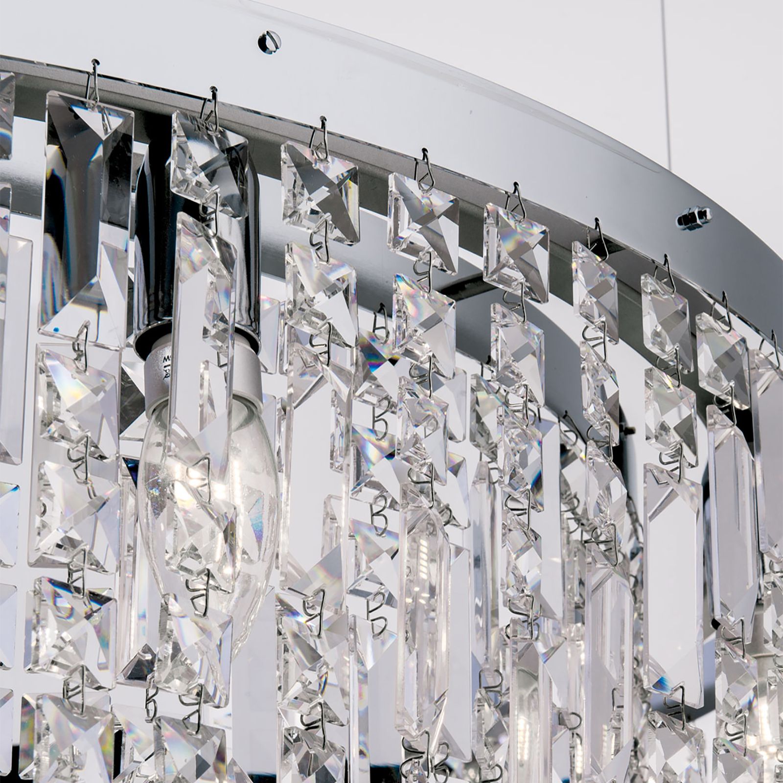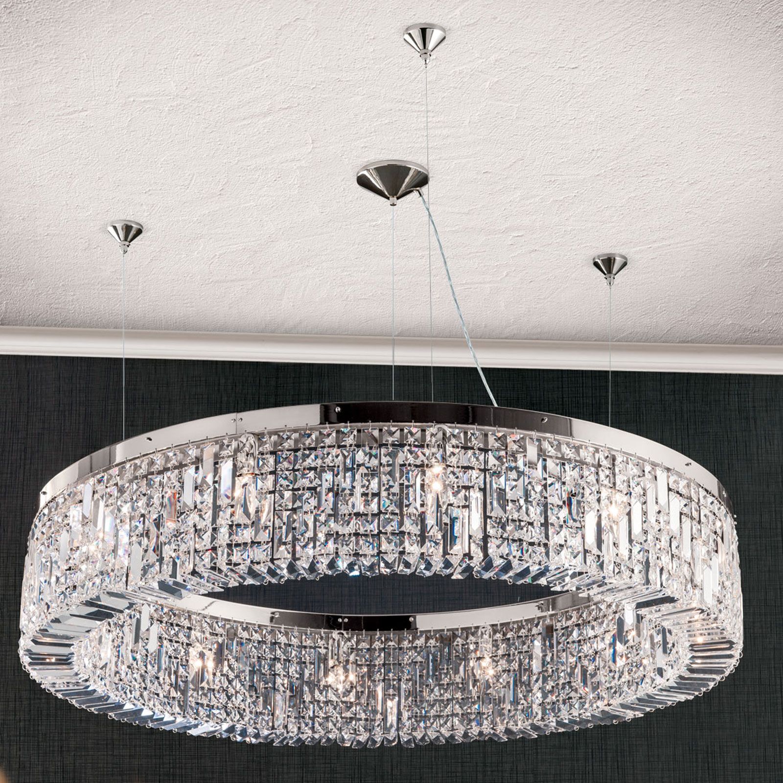 With chandelier RING, an imposing light source enters every living room be it be furnished either in classical or modern style. For sufficient, stylish lighting, it is ideally suited above dining tables or centrally in living rooms. In entrances, it radiates glamorous, hospitable charm bathing the room in a pleasant light. Asfour crystal chandelier in prism form gives the chandelier a unique sparkle intensified by the frame's shiny finish. Equipped with remarkable 12 bulbs in E14 sockets, it can be fitted with 40 watts maximum of 40 watts. The chandelier with a diameter of 110 cm and a height of 30-160 cm is available in finishes chrome and gold.