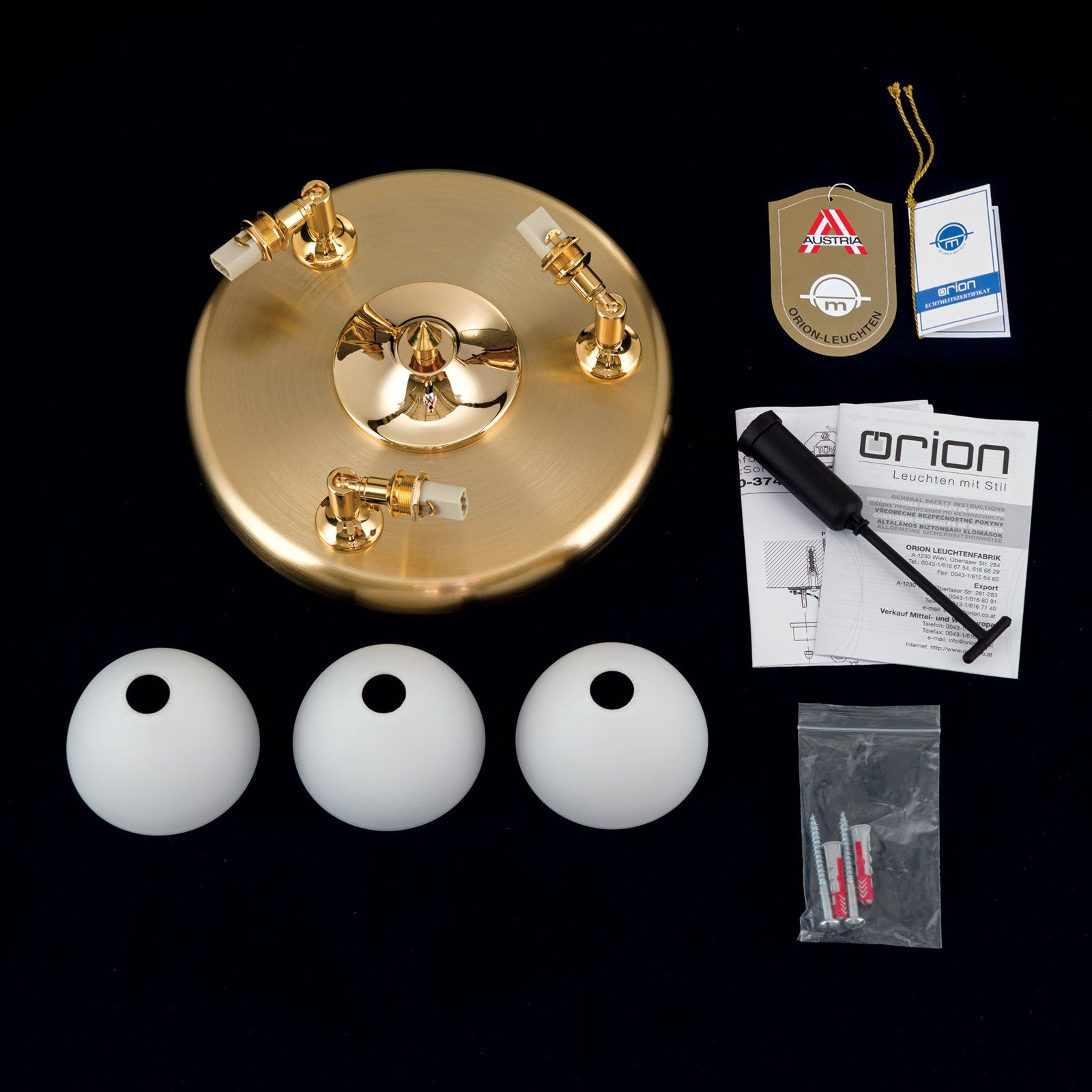 The three-flame ceiling spotlight OPALDESIGN from the eponymous series produced by ORION the Vienna light manufactory has a pure and timless presence. Its three spotlights are mounted on a round decorative plate also serving as canopy and can be individually swivelled as well as rotated. The quality brass and opal glass give the light a high-quality look reinforced by the surface finishes in gold matt or satinated.