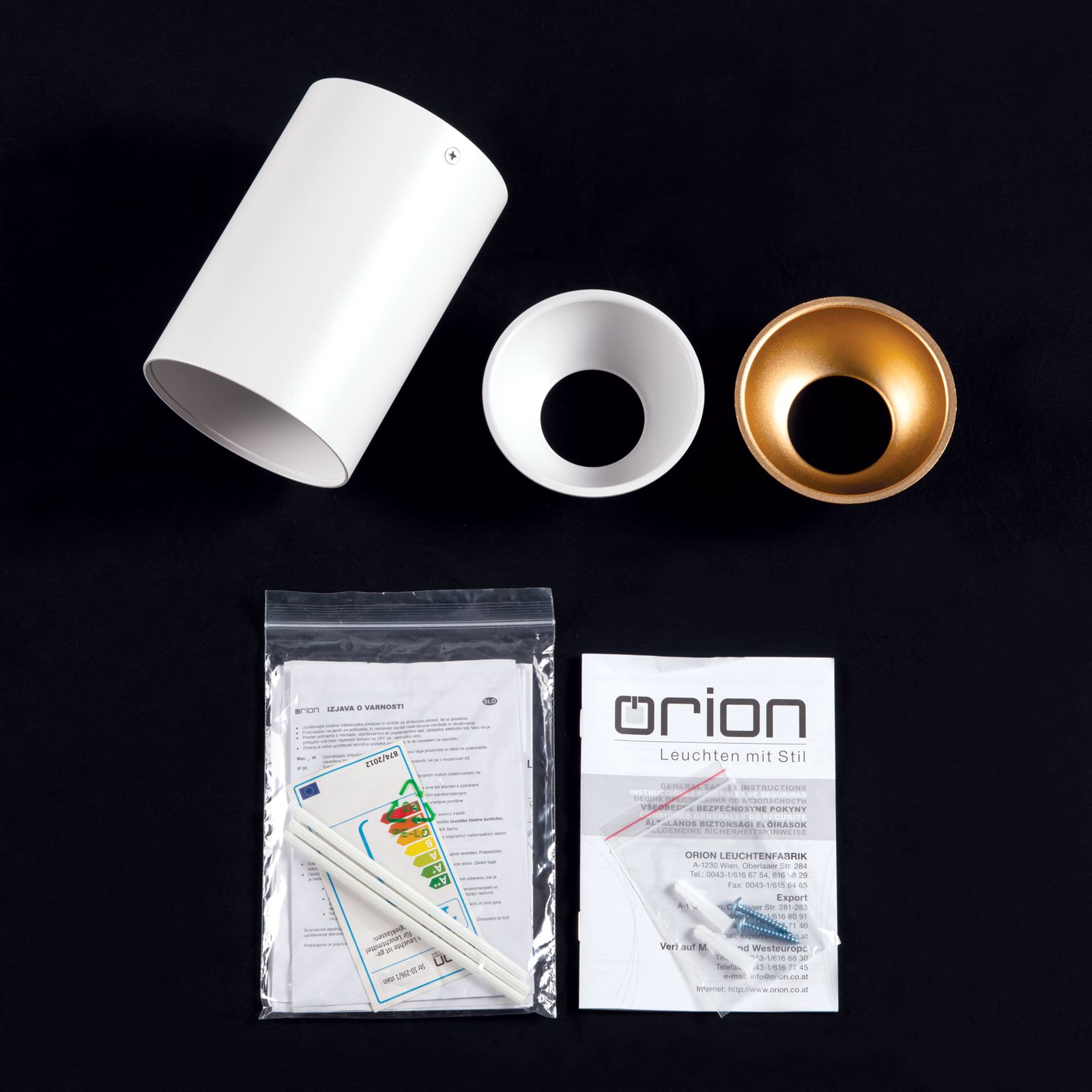 The ceiling light STARLIGHT represents a particularly attractive source of light, because the inside of the light can be replaced with an additional internal reflector in gold, so that by the light the golden surface begins to shimmer. STARLIGHT can be integrated into both modern and classic living spaces, where as a single luminaire for accent lighting or grouped, they bathe the room in a pleasant light. The cylindrical housing in white or black harmonizes wonderfully with the golden interior and rounds off the overall appearance of the light. In addition, the golden reflector provides a particularly warm light. The light with a diameter of 9.6 cm and a height of only 14 cm is also ideal for rooms with low ceilings. Equipped with a GU10 socket, this can be operated with a maximum of 50 watts.