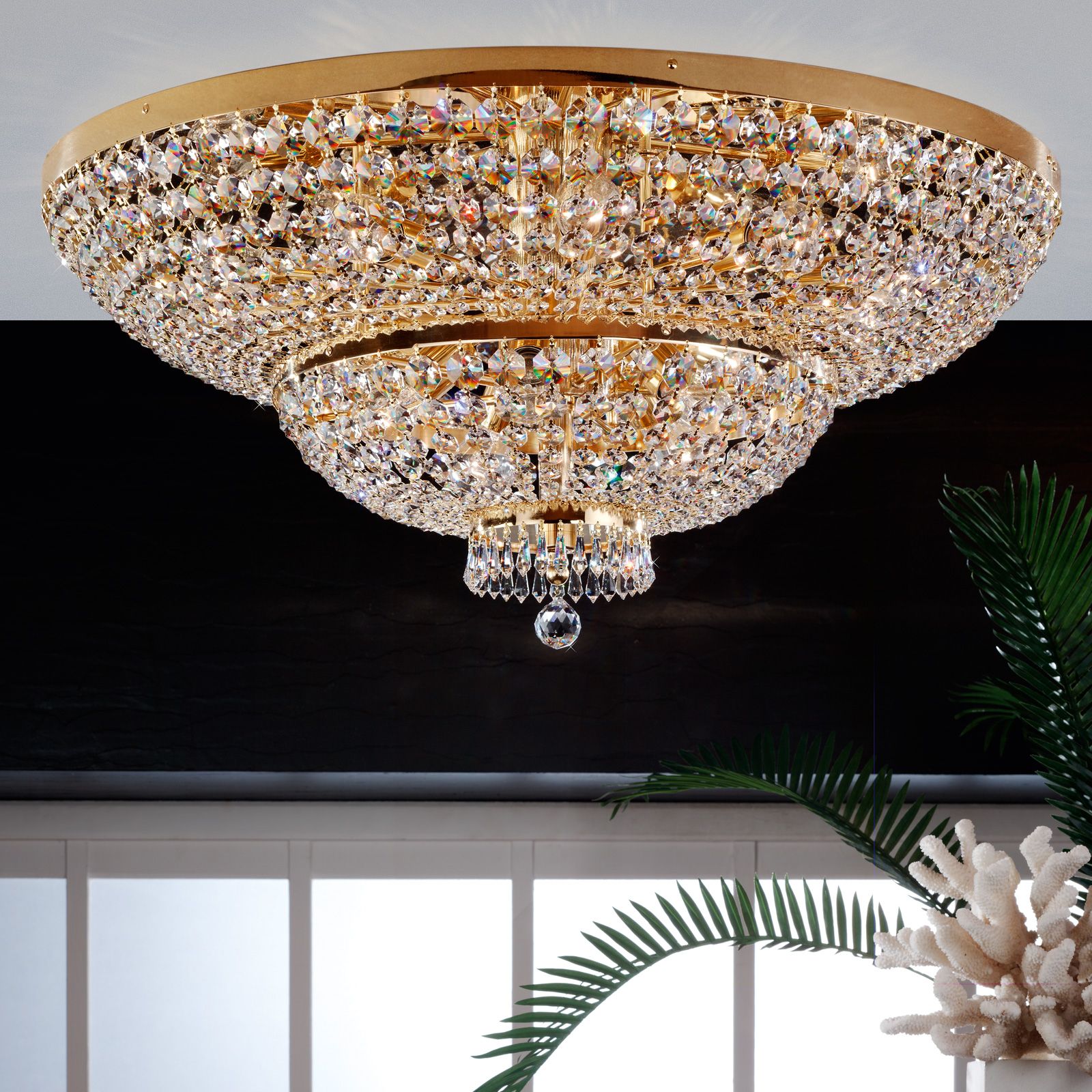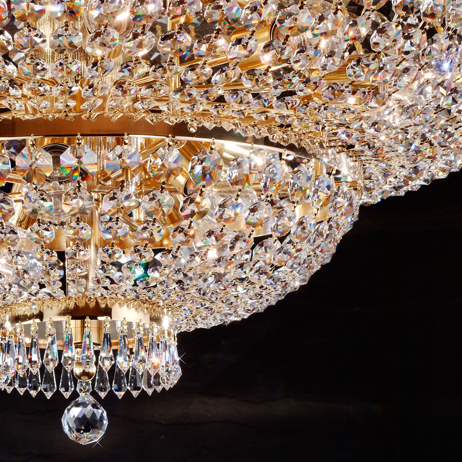 The round frame made of solid brass has a diameter of 105 cm and height of 45 cm. SCHÖLER CRYSTAL® octagons are linked into chains to cascade downwards, where they end on a mirrored decorative plate. The plate rim is adorned with drop-shaped crystals. The finial is a faceted crystal ball placed in the centre and reflected in the mirrored decorative plate. The many crystals refract light, creating beautiful light reflections that invite admiration. 15 E27 sockets for 60 watts maximum each, sit behind the crystals to illuminate them from the inside setting off countless light refractions again reflected to a specatcular light play.