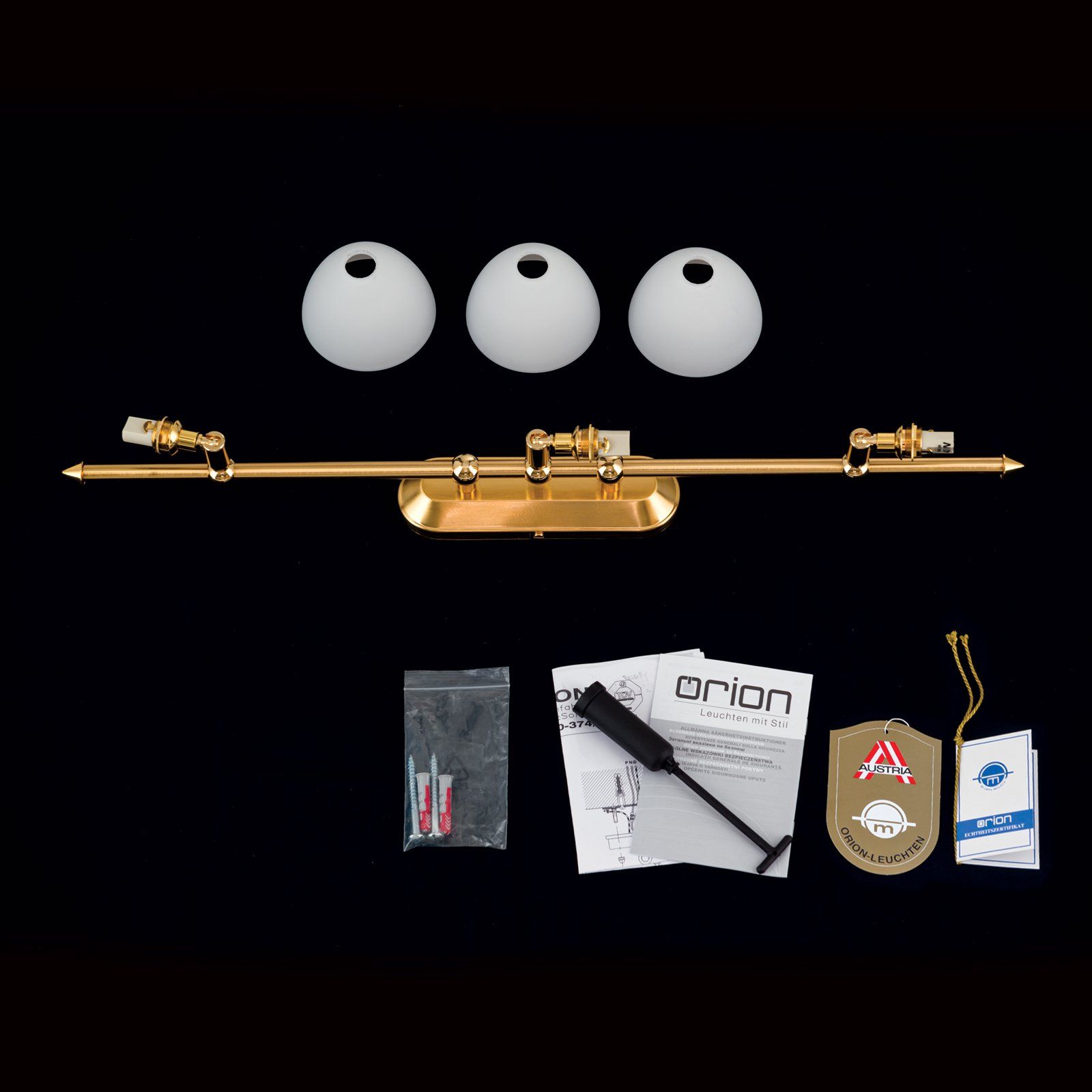 The 3-flames spotlight from the OPALDESIGN series easily integrates into a wide variety of interiors with its classically restrained design. The luminaire mount is made of high-quality and durable brass with finish in gold matt or satinated; the shade is made of opal matt glass. The spotlight is equipped with 3 G9 sockets that can be fitted with 40 watts each.