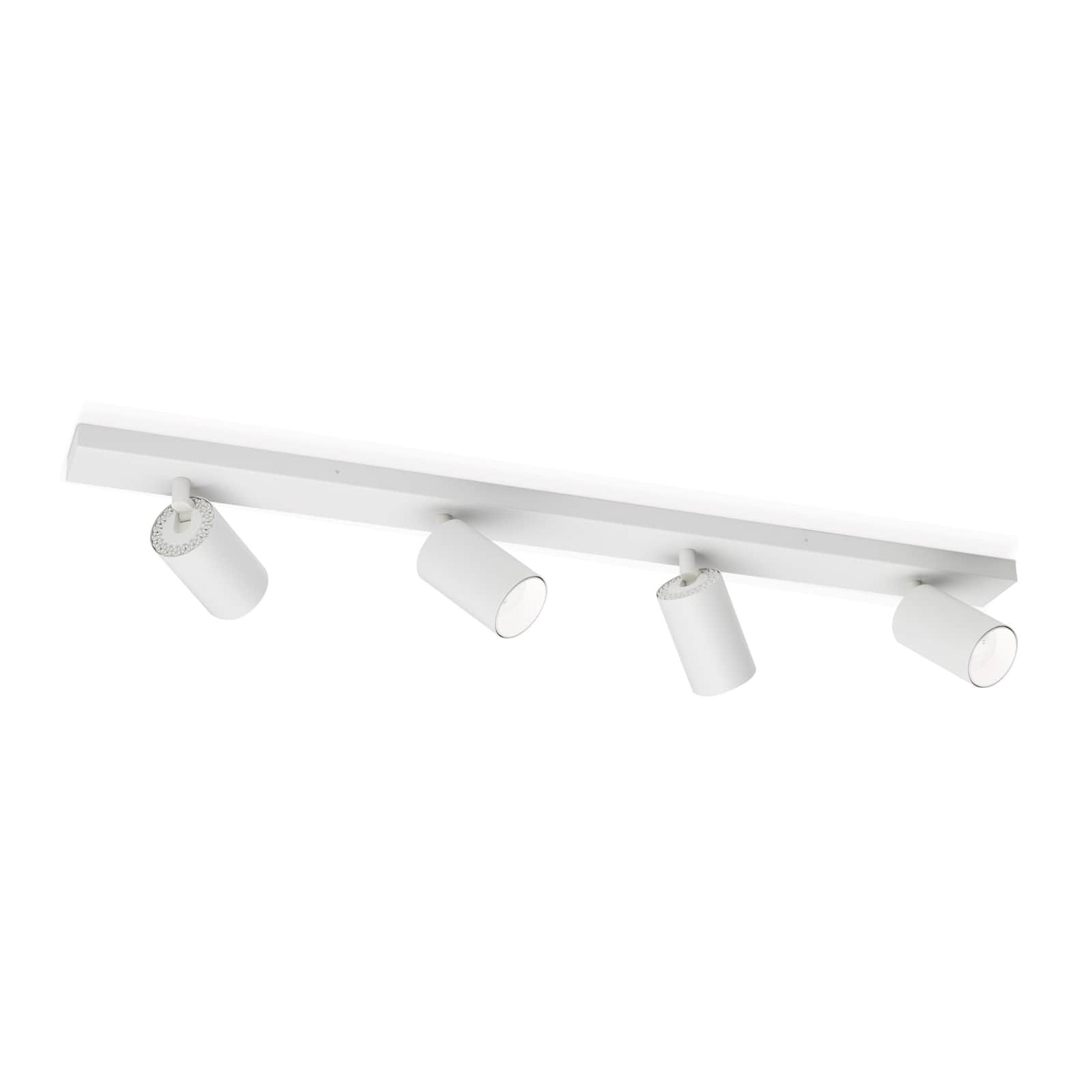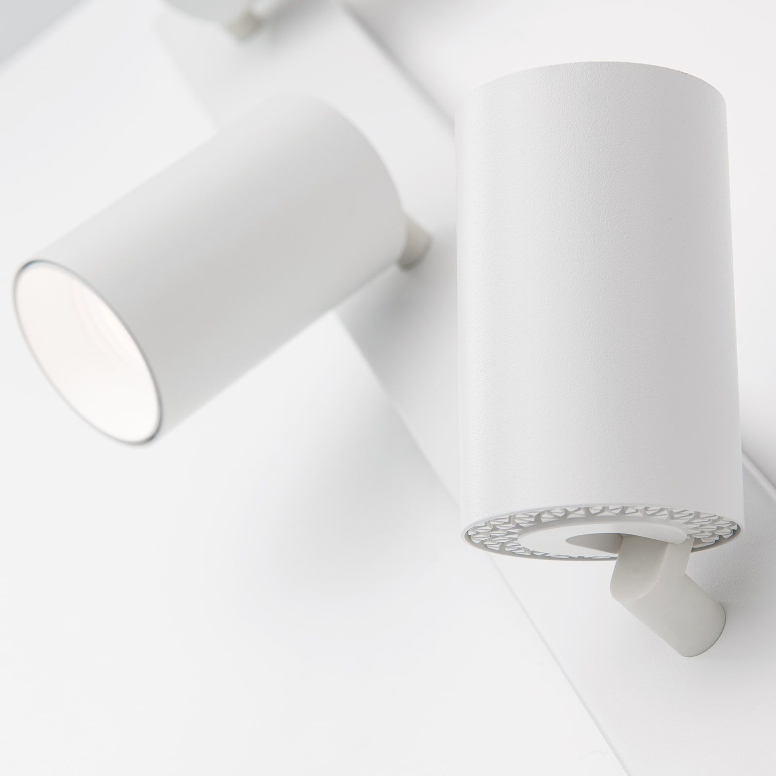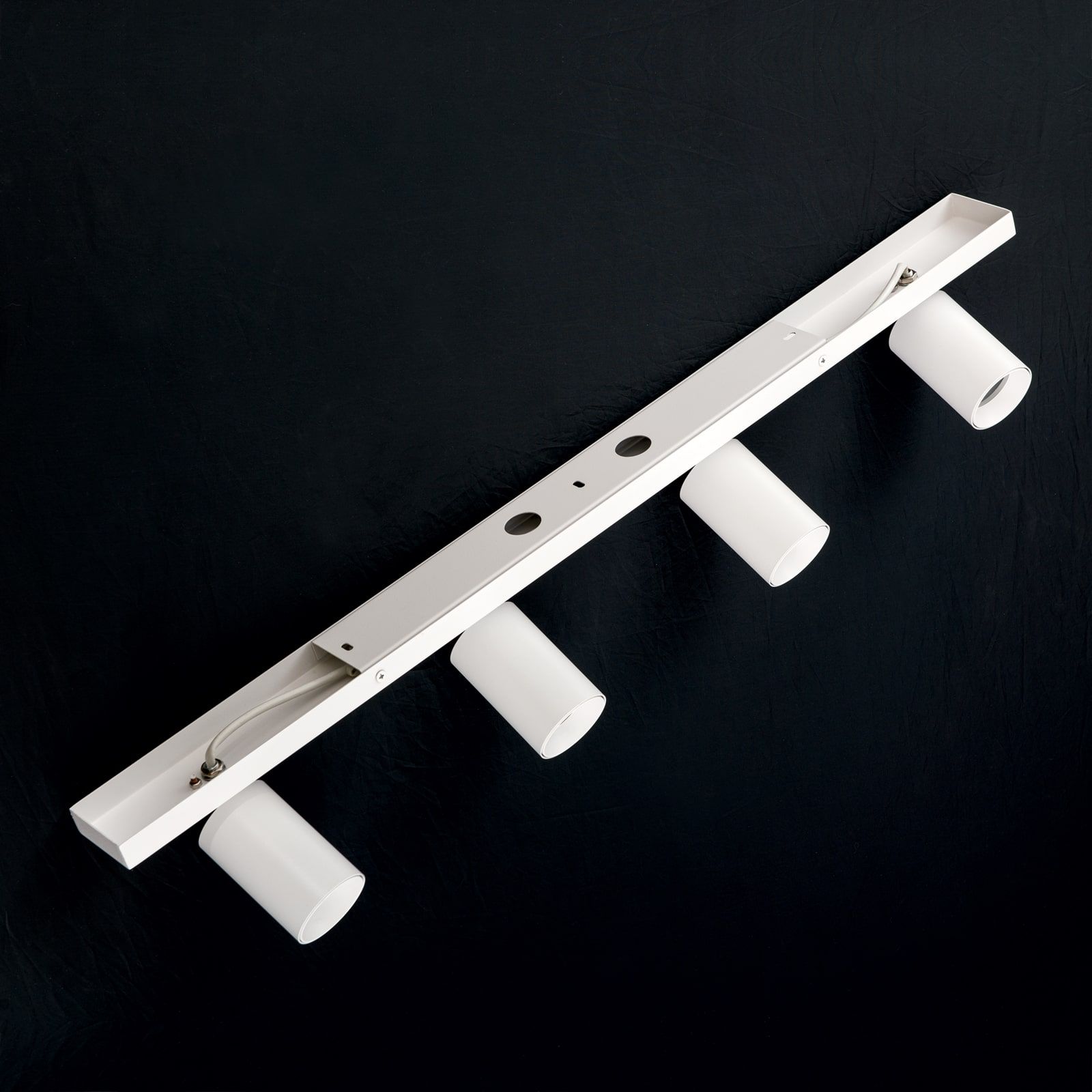 The spotlights from the SEAN series are in no way inferior to their design models from the 1960s and 1970s. Their basic geometric bodies, four cylinders, blend in with white ceilings or, in the black version, make a contemporary statement on a dark ceiling. SEAN corresponds perfectly with modern furnishing styles and is the ideal choice for decentralised room lighting concepts. The luminaire strip can be mounted horizontally or vertically on ceilings as well as on walls. This makes them suitable for any type of spot lighting: a picture gallery, individual decorative objects on shelves or dressers, a vase of flowers. The four flames are each equipped with a GU10 socket for 13 watts maximum.