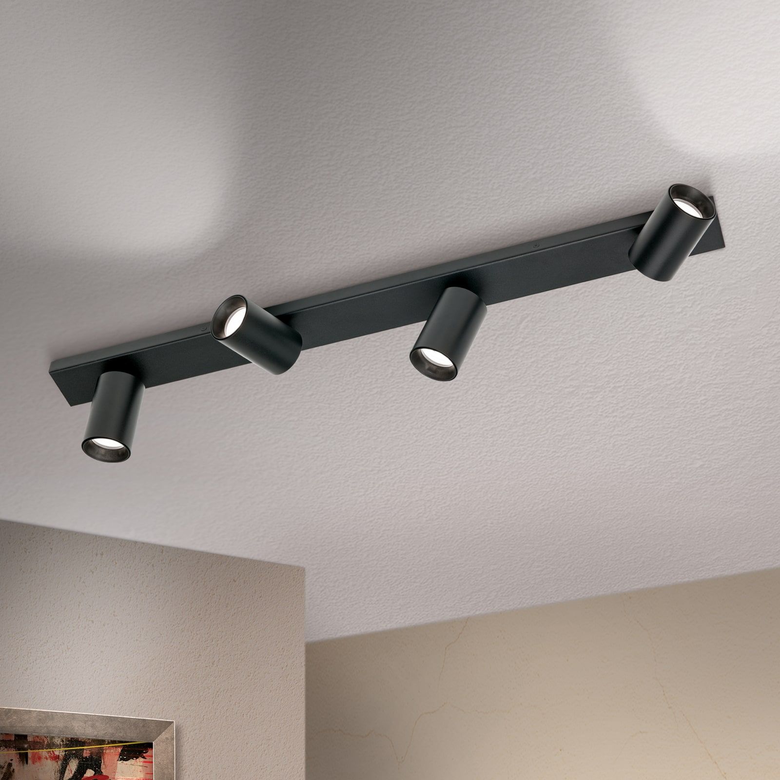 The spotlights from the SEAN series are in no way inferior to their design models from the 1960s and 1970s. Their basic geometric bodies, four cylinders, blend in with white ceilings or, in the black version, make a contemporary statement on a dark ceiling. SEAN corresponds perfectly with modern furnishing styles and is the ideal choice for decentralised room lighting concepts. The luminaire strip can be mounted horizontally or vertically on ceilings as well as on walls. This makes them suitable for any type of spot lighting: a picture gallery, individual decorative objects on shelves or dressers, a vase of flowers. The four flames are each equipped with a GU10 socket for 13 watts maximum.