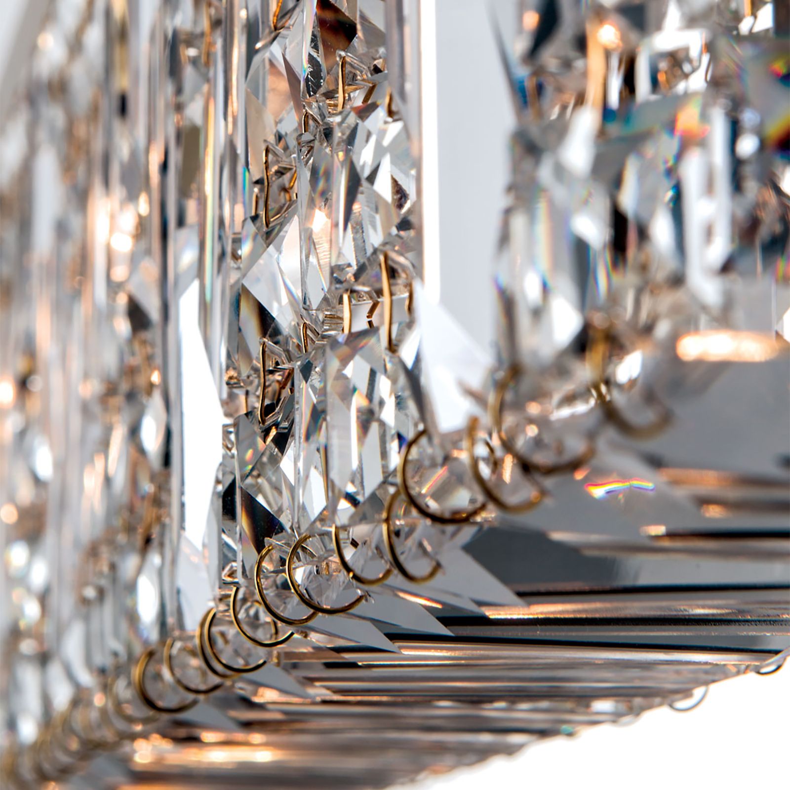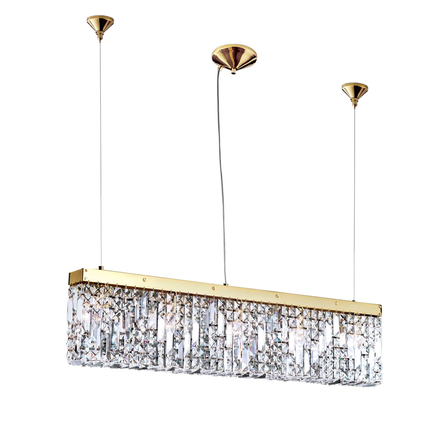 With pendant lamp RING, a piece of elegance and exclusivity entrs every home. Mounted above dining tables, living room tables or counters, it not only is a decorative furnishing element, but also illuminates the room perfectly. The pendant lamp consists of a shiny brass frame, to which a multitude of clear Asfour crystals are attached, creating a noble, coordinated overall picture. Before light spreads throughout the room, it must first make its way through the numerous crystals, giving off beautiful light reflections and a dignified ambience. The lamp body's shiny finish supports the radiant effect, which is not only revealed when the lamp is switched on. Equipped with 5 E14 sockets, it can be fitted with 40 watts maximum. If desired, it can be dimmed and adjusted to individual requirements.