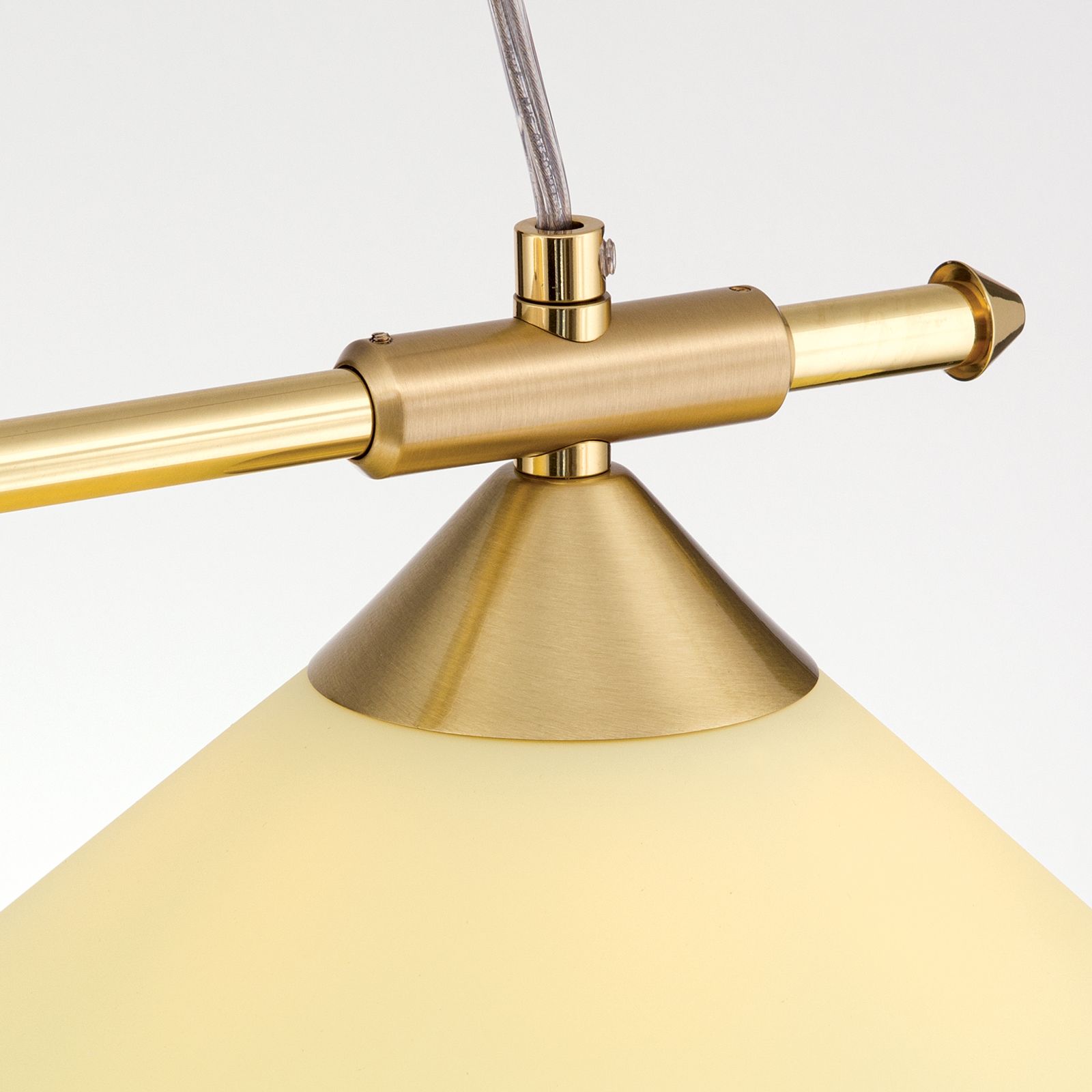 The conical cone glass is mounted on an arrow-shaped, horizontal solid brass rod to ensure soft light diffusion. It is excellent as dining room lighting above family tables.