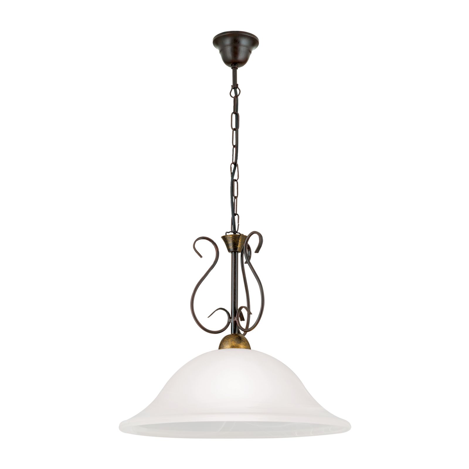The steel frame presents itself with antique gold finish and three curved decorative elements on the light arm's side. The opal matt glass shade with 40 cm diameter blocks the light with its satin finish and lets its luminosity shine downwards. This lighting effect is optimal for illuminating food skillfully putting it in the limelight.