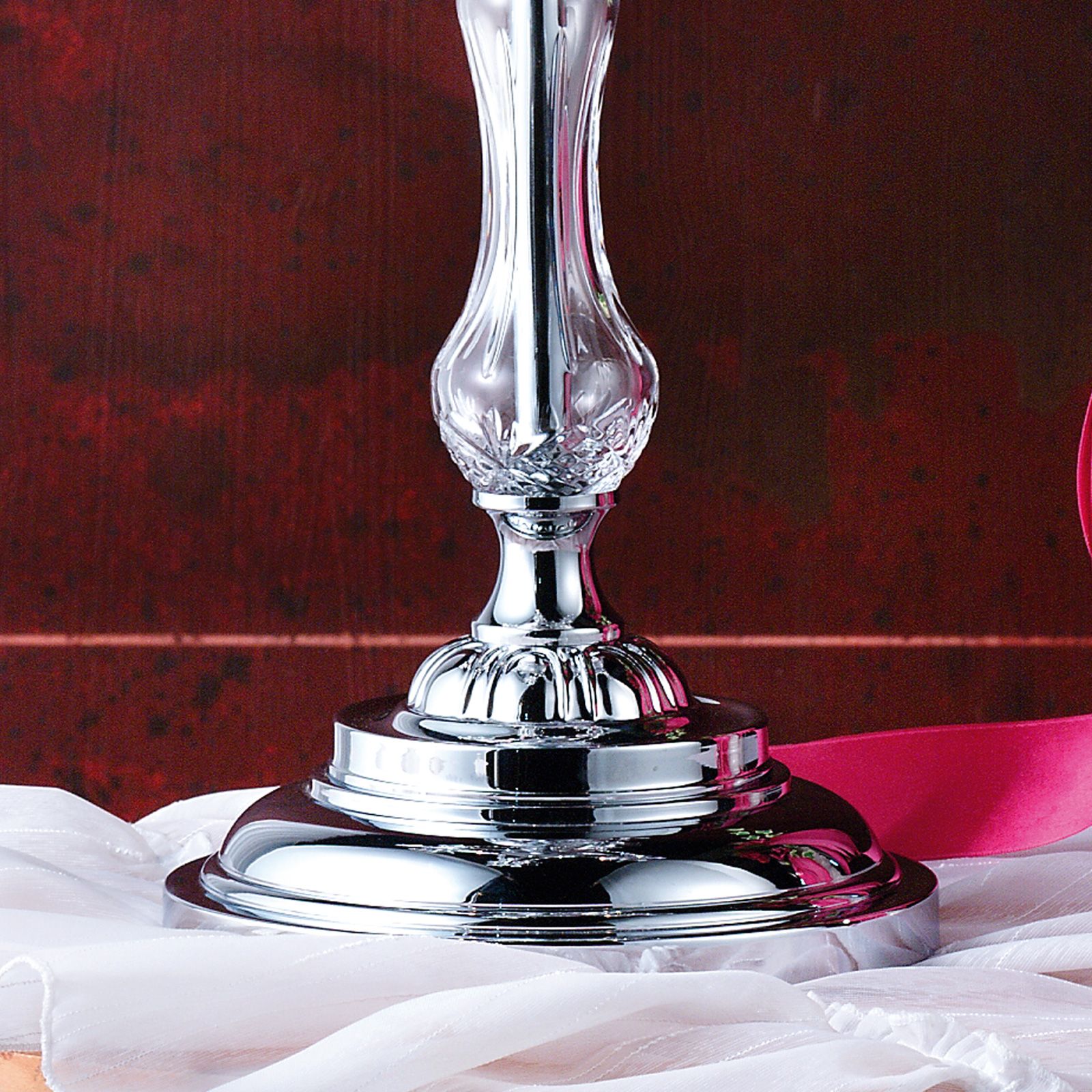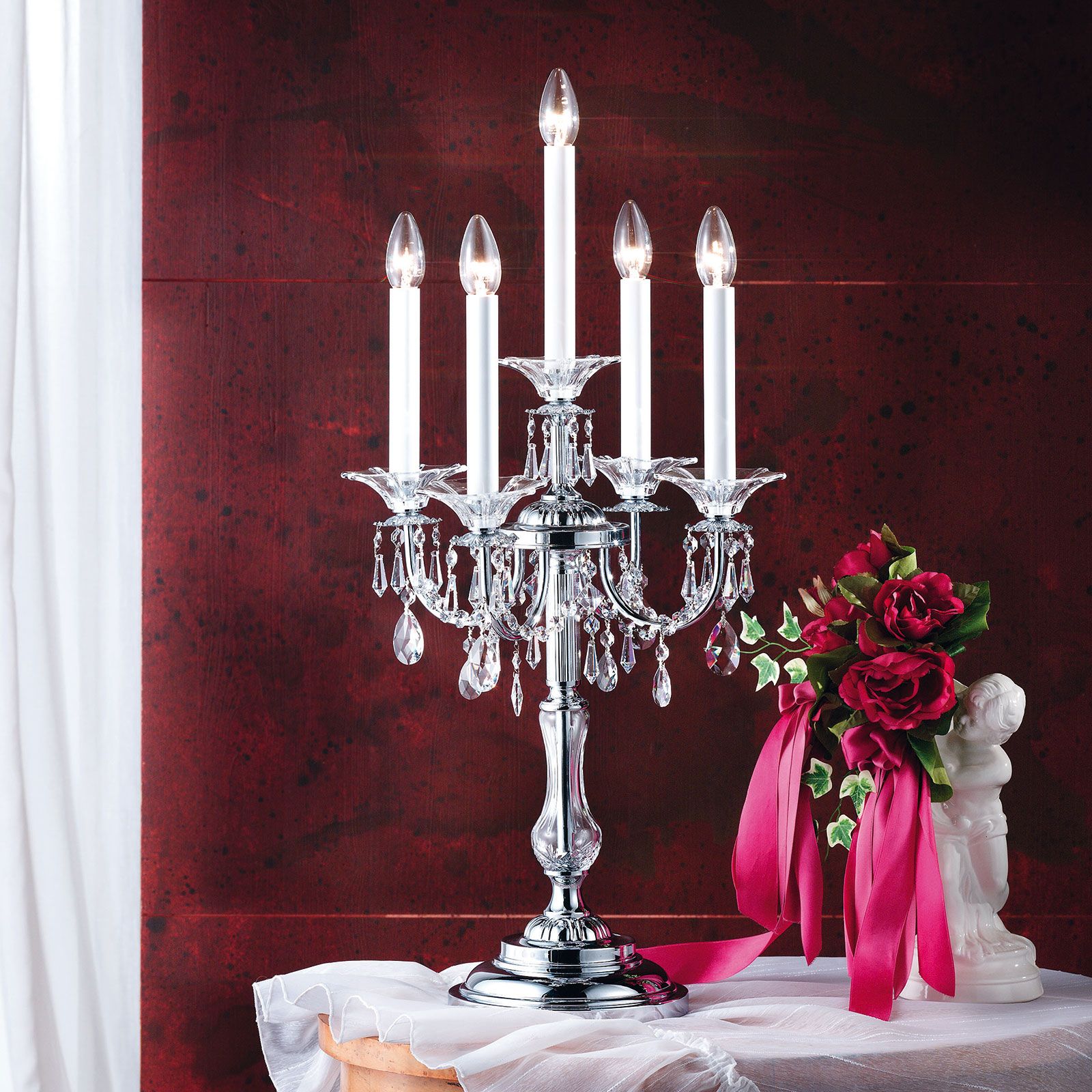 The lamp stand is made of brass with chrome finish and is decorated with prisms and octagons from Swarovski. A crystal cup supports the slender candle sleeve at best completed true to style with candle or windd gust candle bulbs to create the perfect illusion of candlelight. The 5 E14 sockets can be operated with 40 watts maximum per socket.