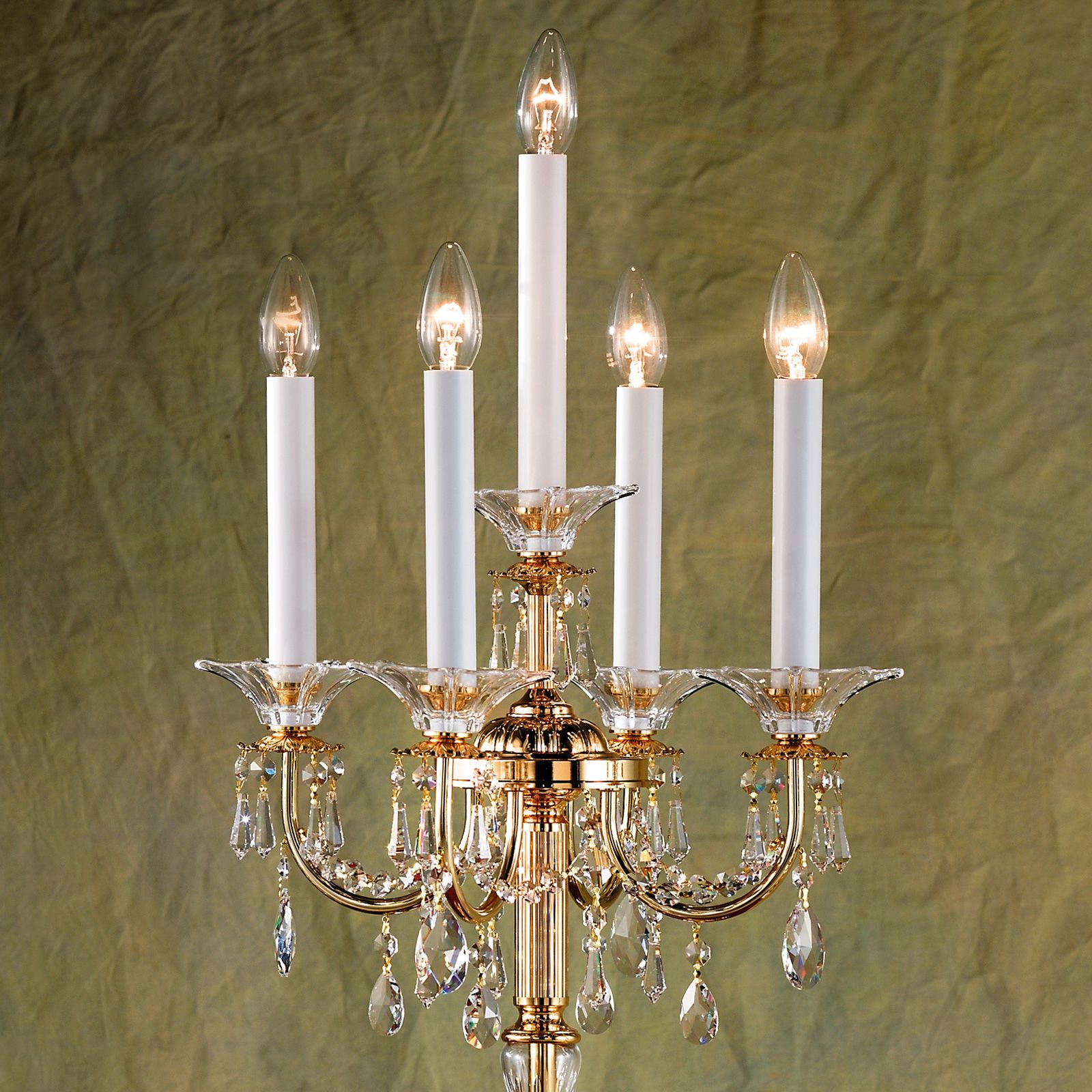 The lamp stand is made of brass with chrome finish and is decorated with prisms and octagons from Swarovski. A crystal cup supports the slender candle sleeve at best completed true to style with candle or windd gust candle bulbs to create the perfect illusion of candlelight. The 5 E14 sockets can be operated with 40 watts maximum per socket.