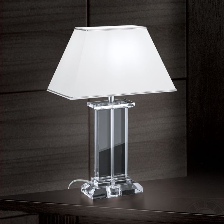 Table lamp VERONIQUE convinces with clear lines and the combination of a gold or silver framed lampshade and transparent crystal body.