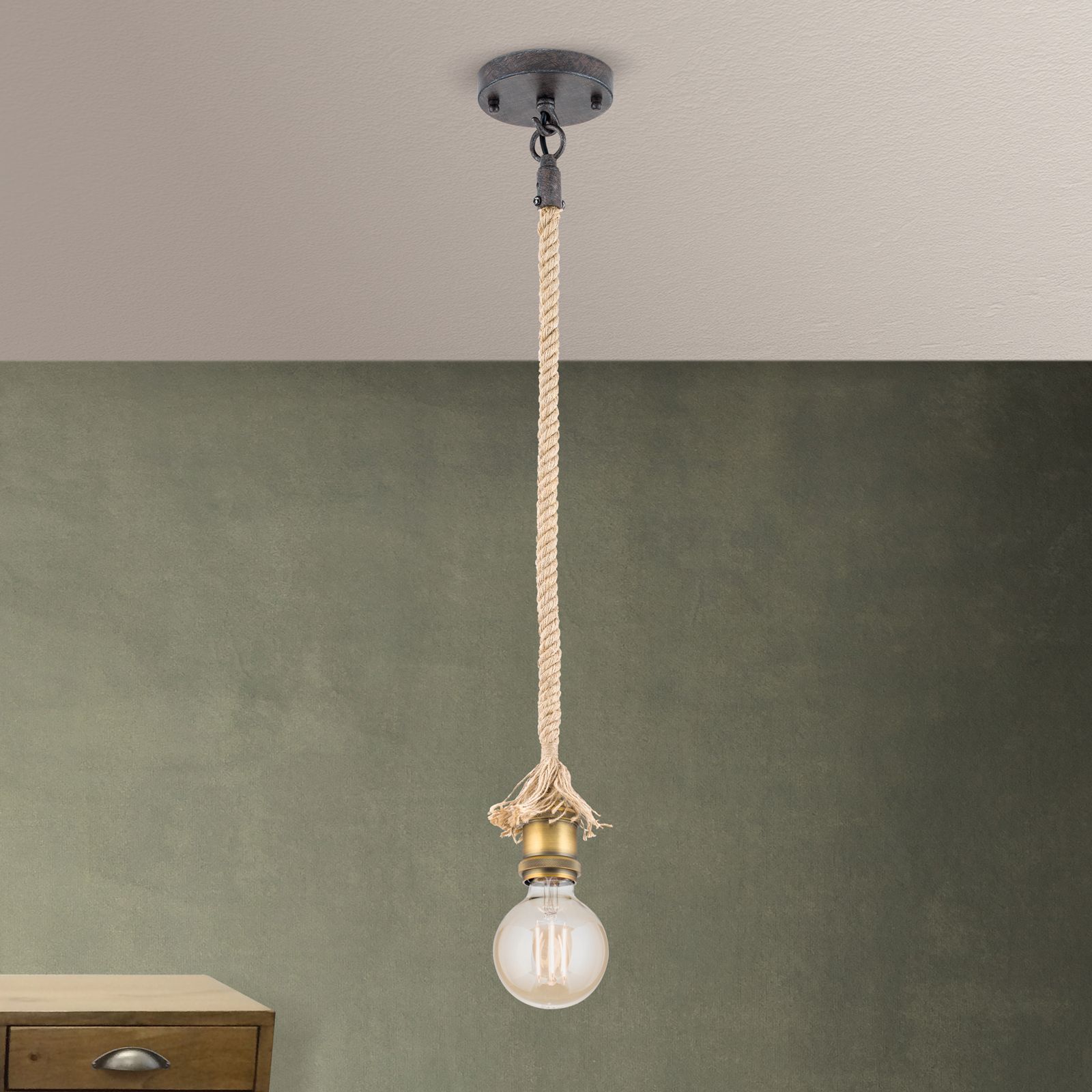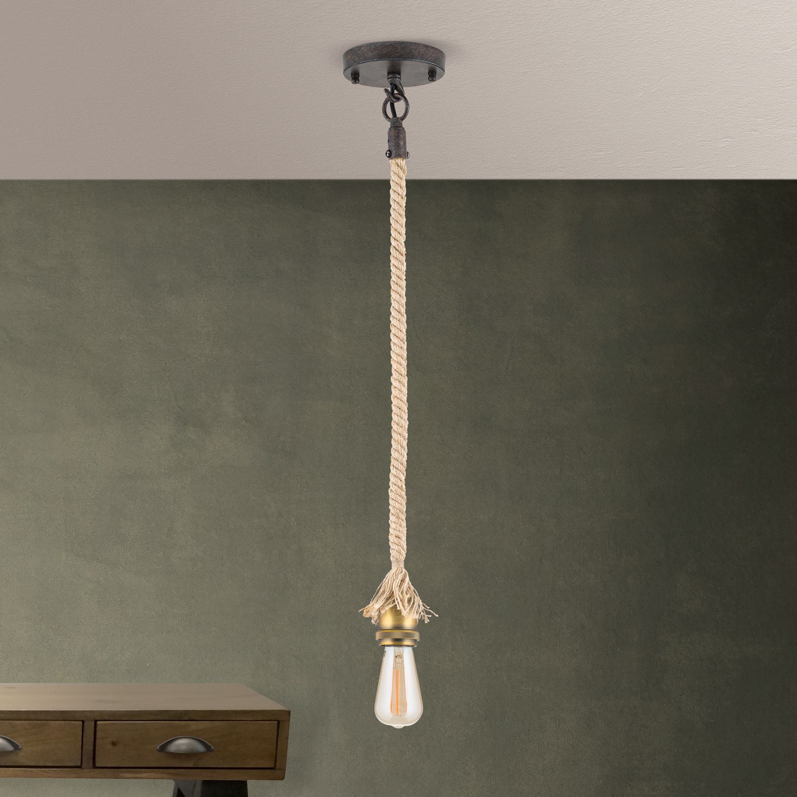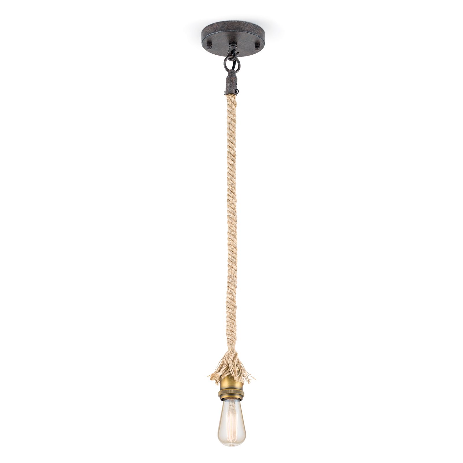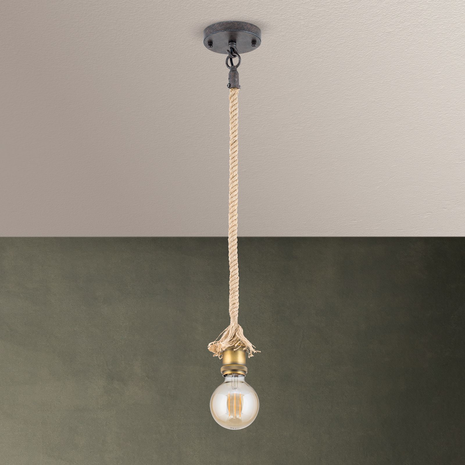 Three simple elements - patinated steel mount with hooks, hemp rope suspension and brass socket - create the memorable shape of the pendant lamp.